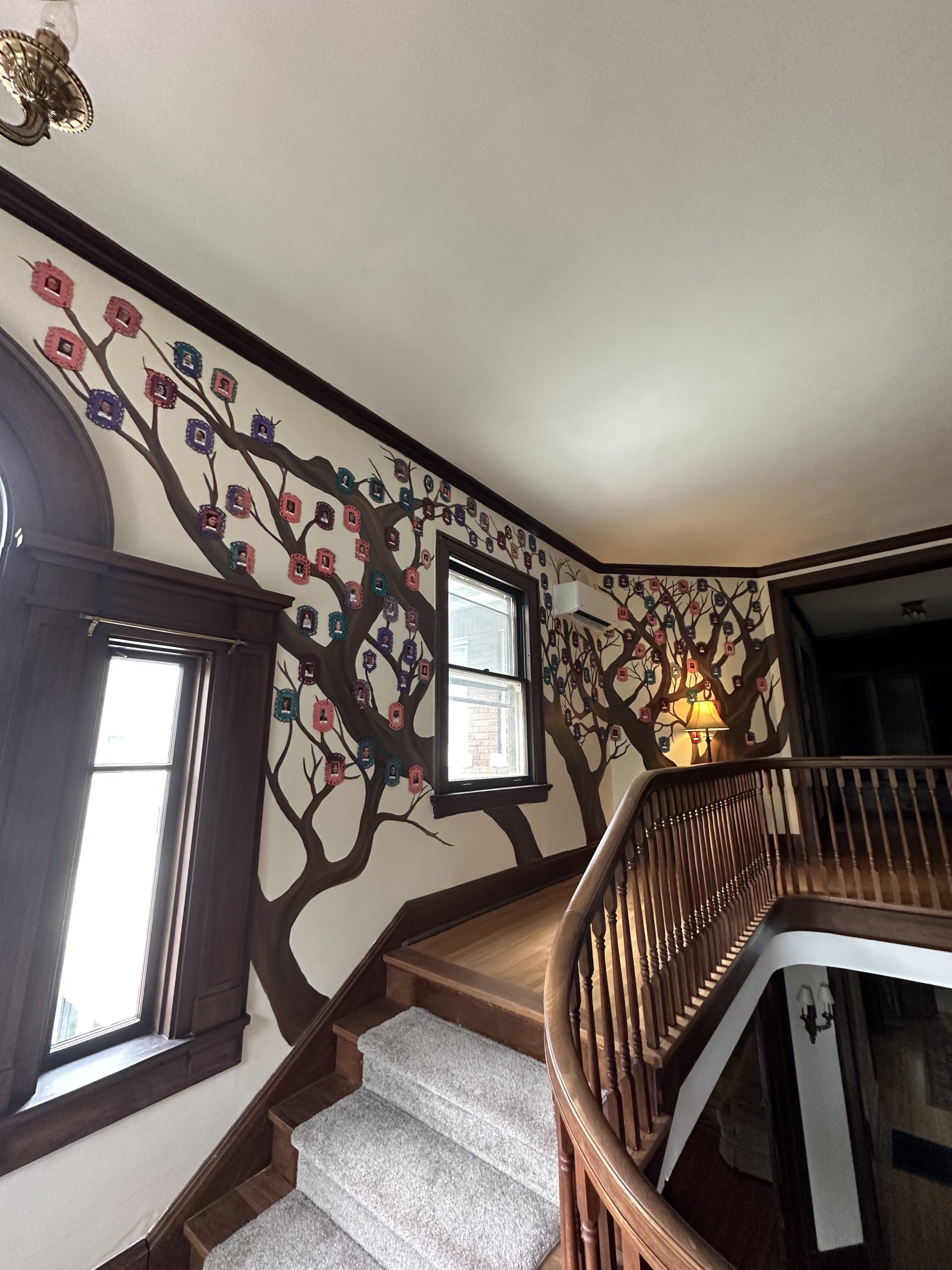 At the top of that staircase, on the second floor, is a tree mural, covered with photos of past residents of 2720 Fairfield Avenue. This house is just one of six homes owned by Redemption House, a transitional housing program that serves as an alternative to incarceration, and the residents pictured in the mural are graduates of the program.