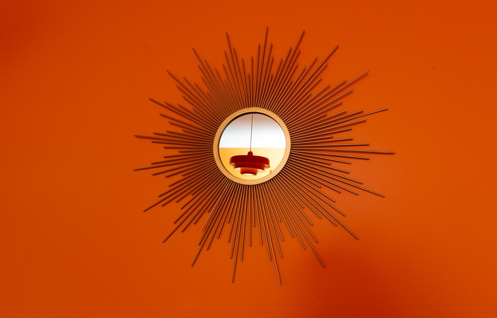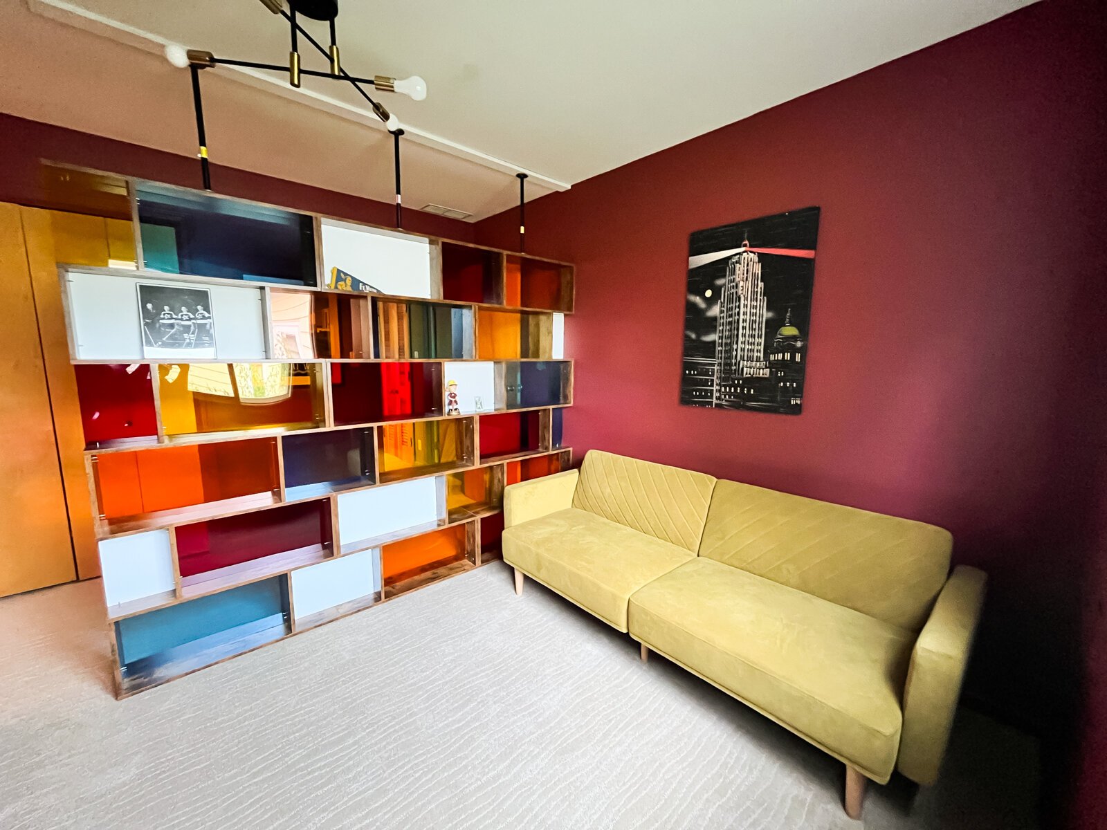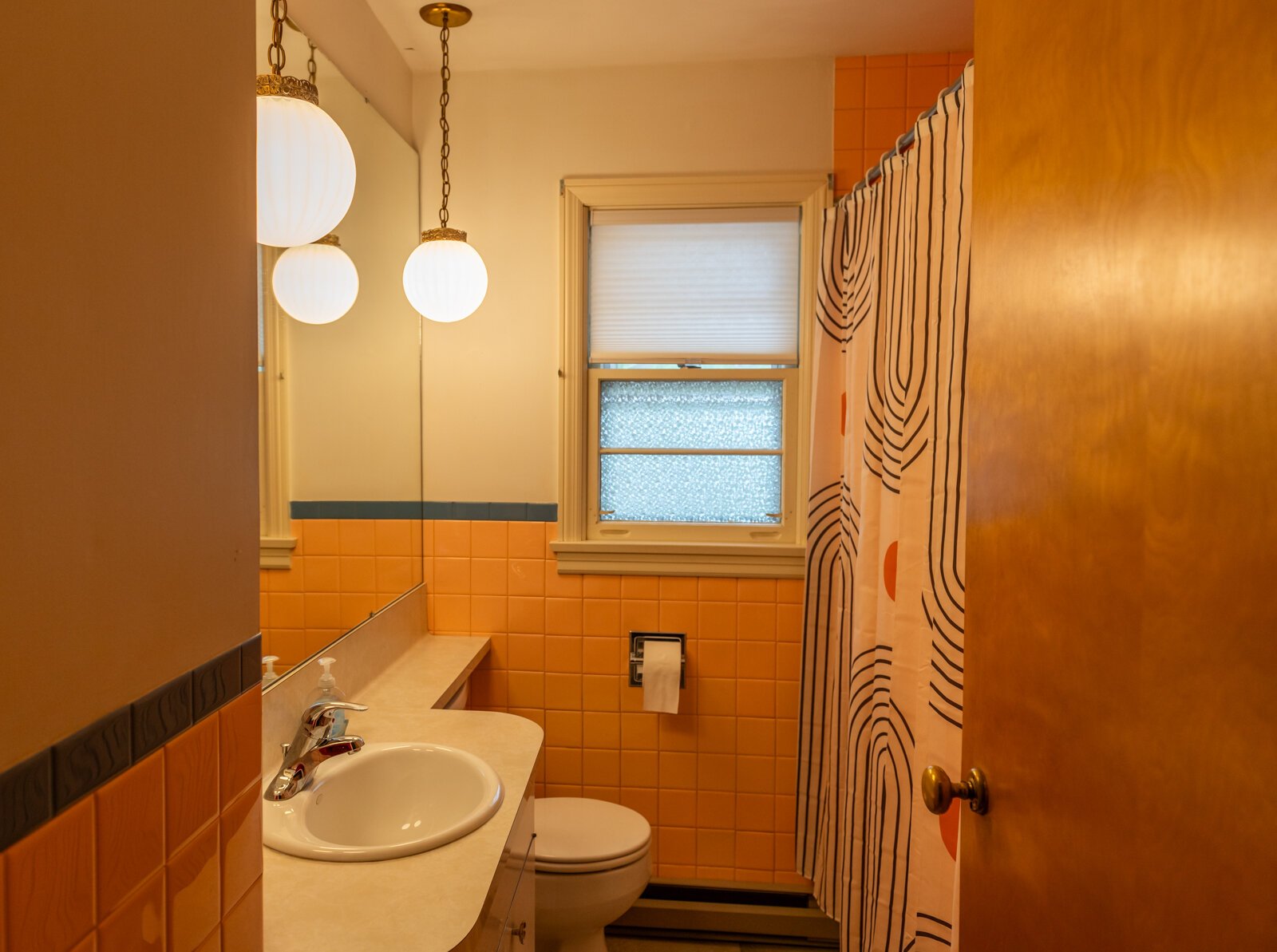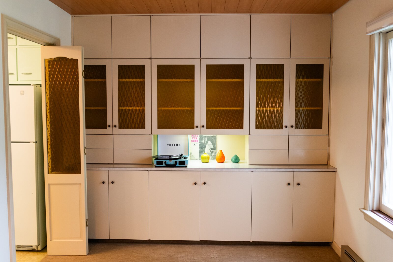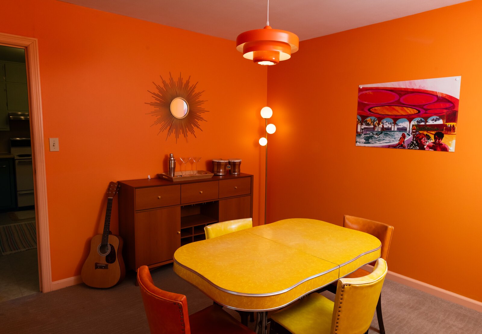 MK: There are several– the living room is California cool with its warm wood planked ceiling, the kitchen with original mint green cabinets, the tangerine orange dining room with requisite bar cabinet, and the Cherokee red den/office with the multicolored room divider.