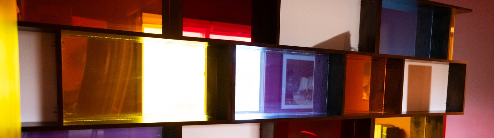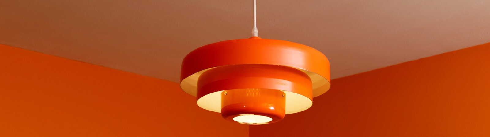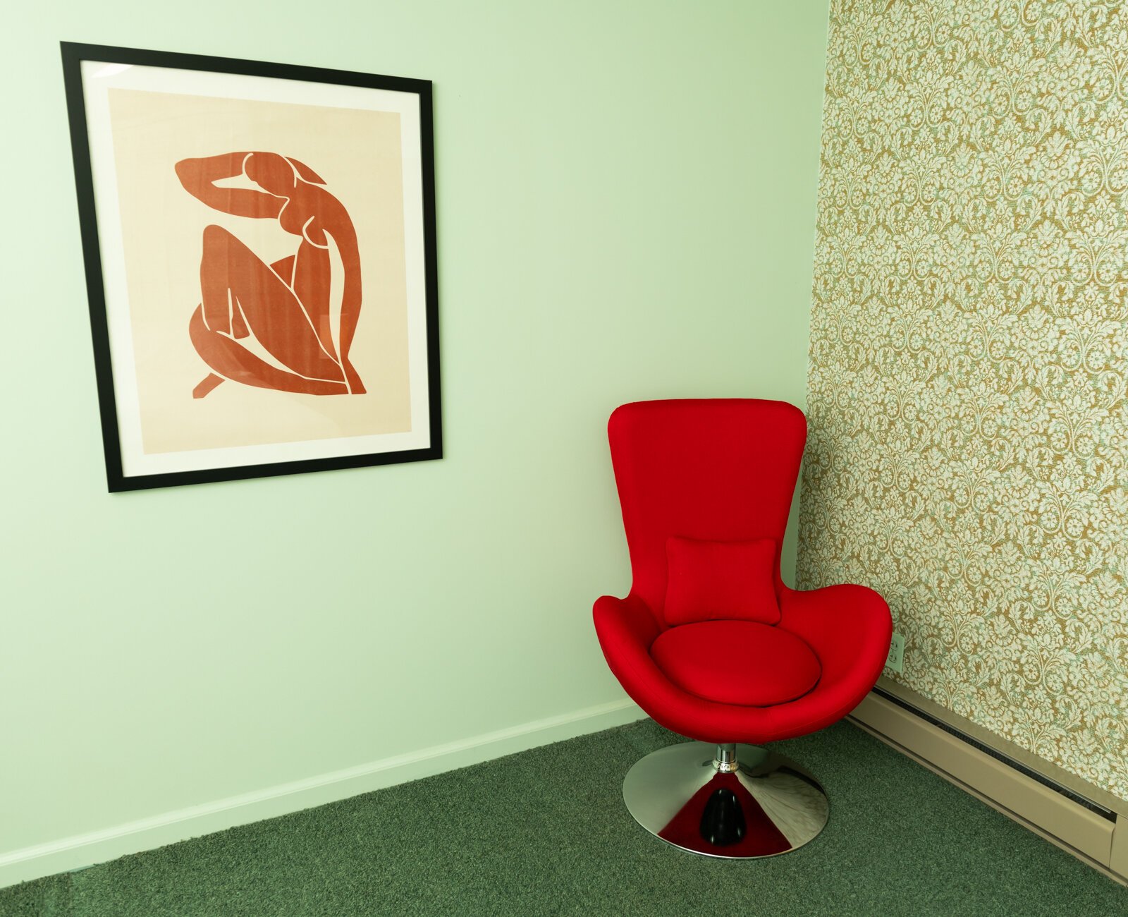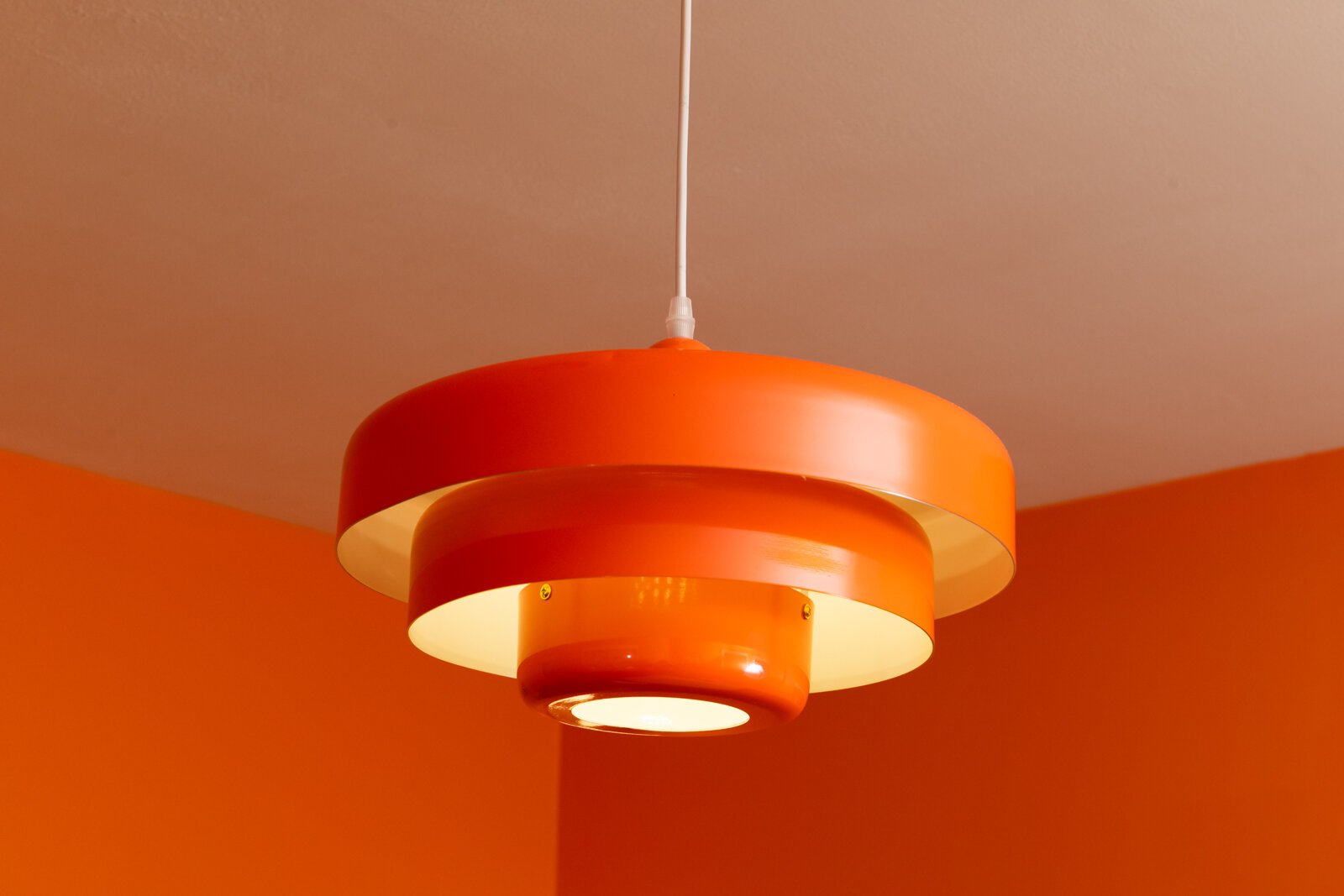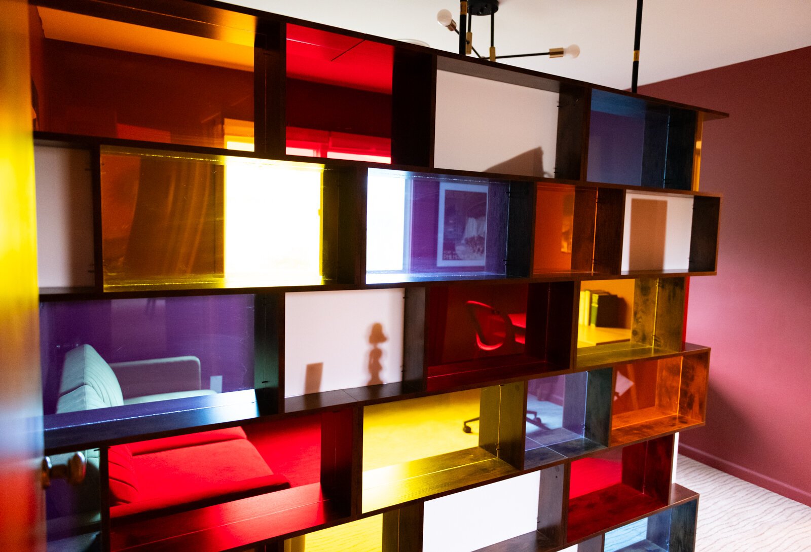 MK: There are several– the living room is California cool with its warm wood planked ceiling, the kitchen with original mint green cabinets, the tangerine orange dining room with requisite bar cabinet, and the Cherokee red den/office with the multicolored room divider.