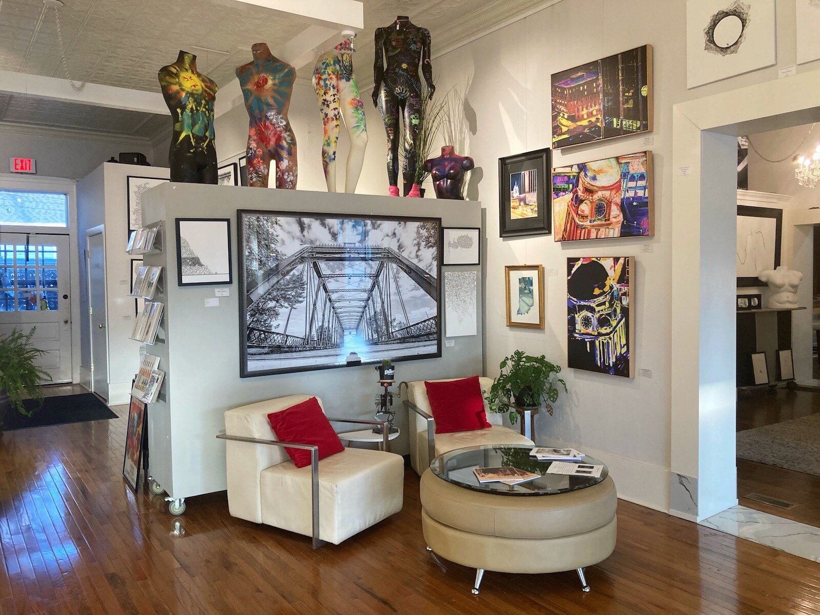 Behind the desk in the back is Kristina Wiley of Gallery K, a local artist and woman of many talents who works in both 2D and 3D media and features the art of more than 40 creators of all kinds in her space. The gallery, which extends through two historic storefronts and into the adjoining insurance agency next door, highlights local, national and international talent. Even the tea Kristina brews for guests is locally made and sold in shop by a company called Lu Garden.