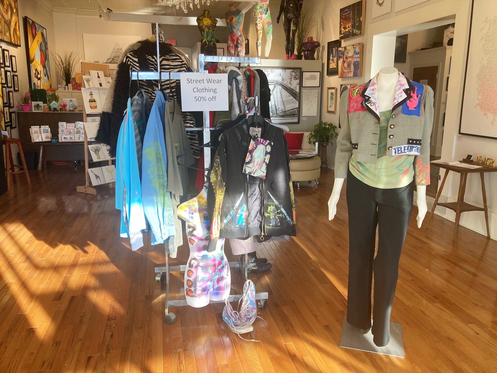 Step inside, and you’ll feel like you’re in a big city art gallery with shiny wood floors, white walls covered in colorful art, crystal chandeliers, decorative ceiling tiles, and upbeat house music thumping through the speakers. Mannequins dressed in retooled streetwear stand near the entry, waiting to greet you.