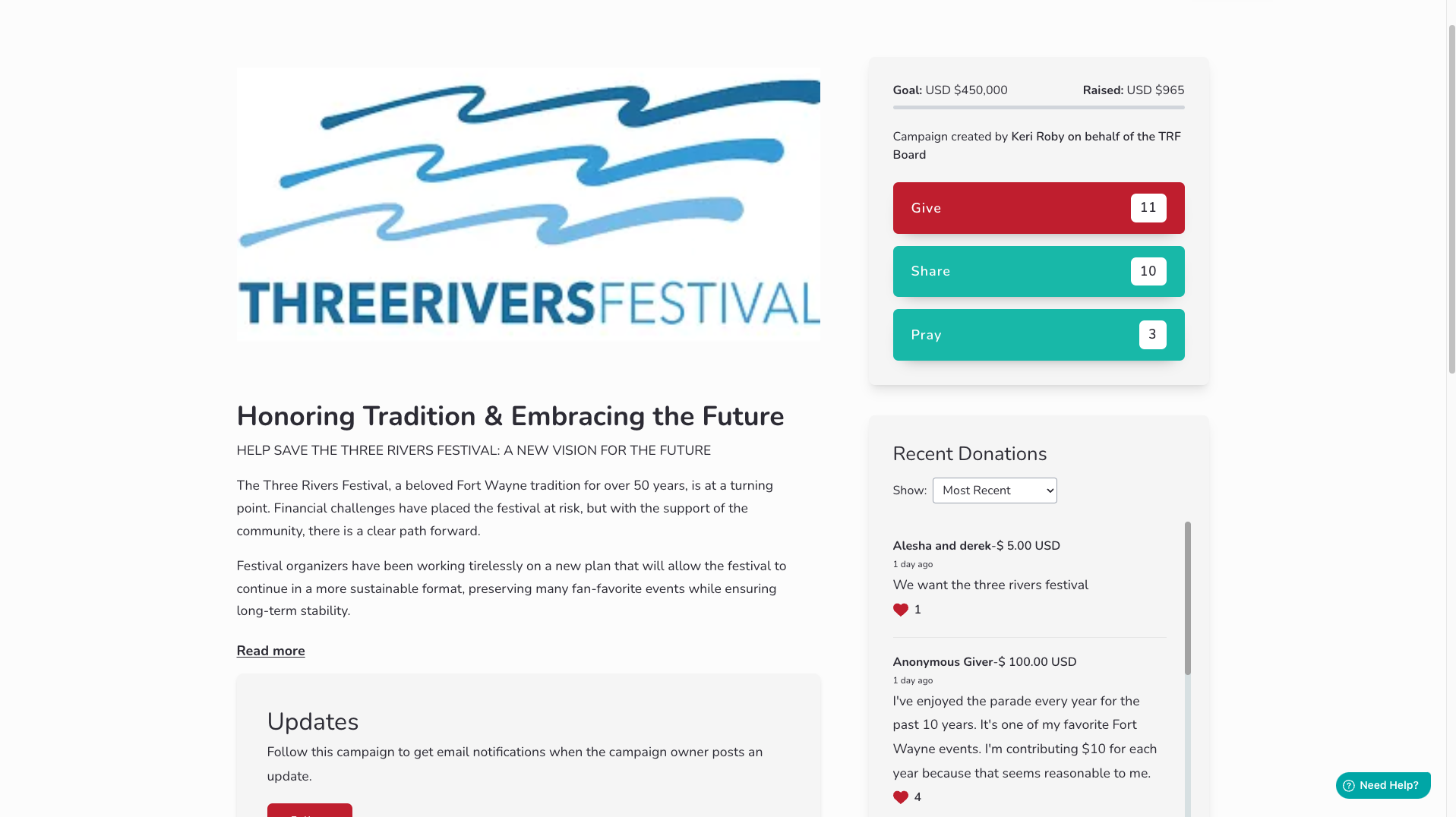 “Three Rivers Festival, a beloved Fort Wayne tradition for over 50 years, is at a turning point,” reads a post from the festival’s Facebook page announcing the campaign. “Financial challenges have placed the festival at risk, but with the support of the community, there is a clear path forward.”