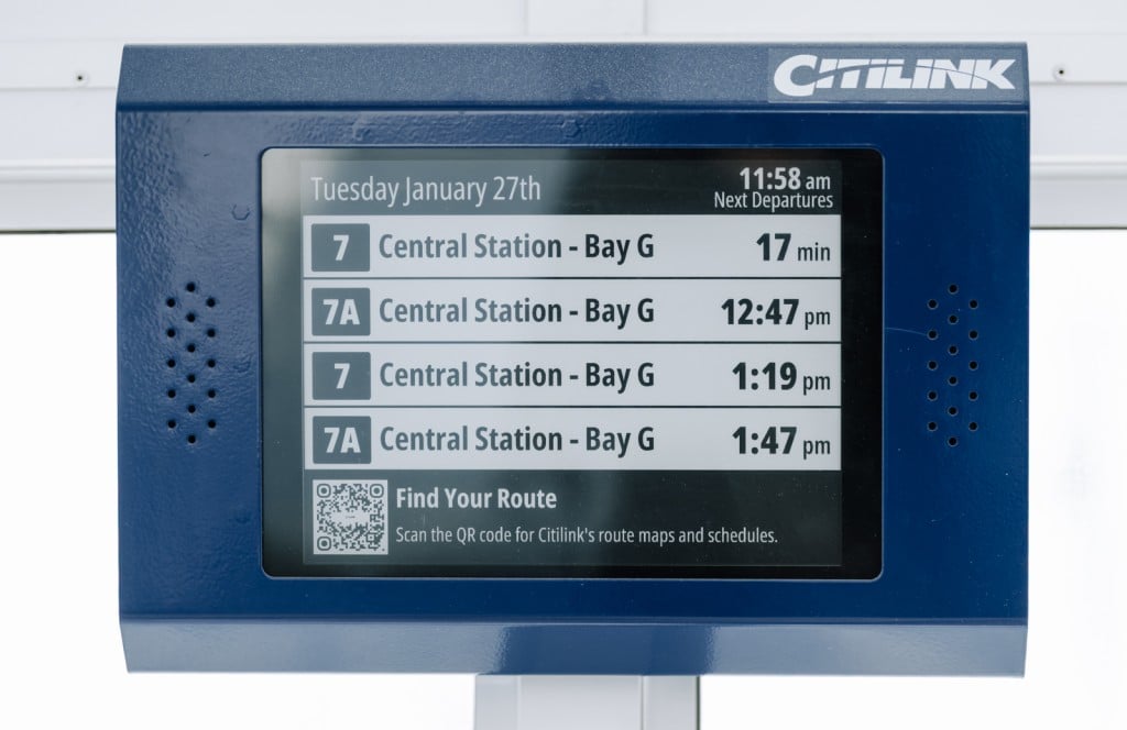 In that report, New York City saw measurable increases in overall ridership after implementing a real-time information system, and found that riders who are more informed about arrival times decrease their total door-to-door transit time. Riders can already access real-time bus information on Citilink’s website, but the accessibility of the screen can still help riders with and without disabilities ride the bus.