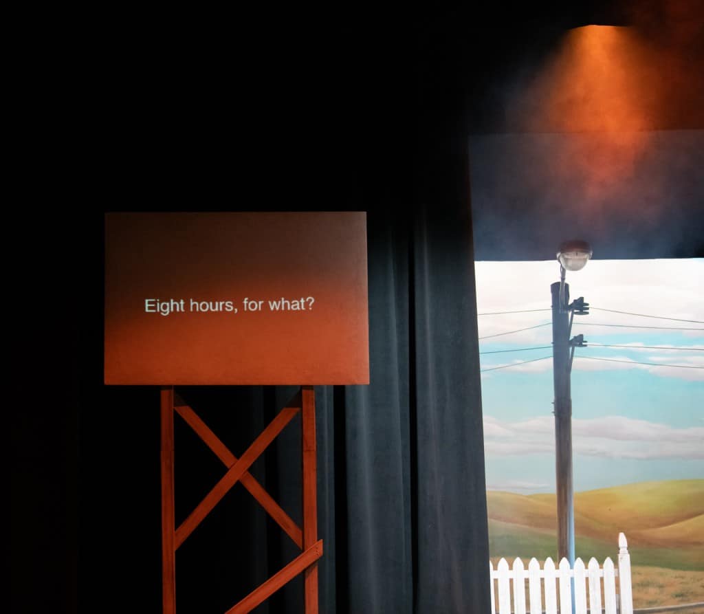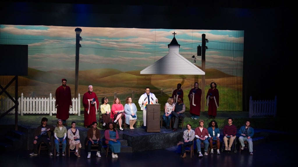 Captioning is provided for audience members via a screen that is incorporated into the set for the Civic Theatre’s production of “Footloose.” Photo by Rachel Von Art LLC.