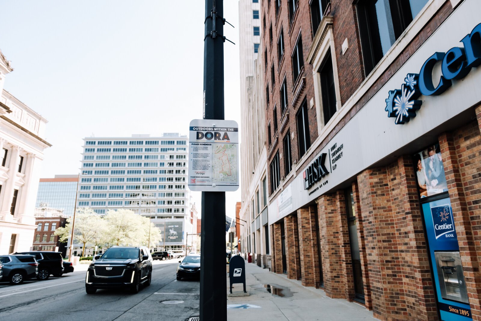 A sign at Wayne St. and Calhoun St. in downtown Fort Wayne reminds people of the rules within the new DORA (Designated Outdoor Refreshment Area).
