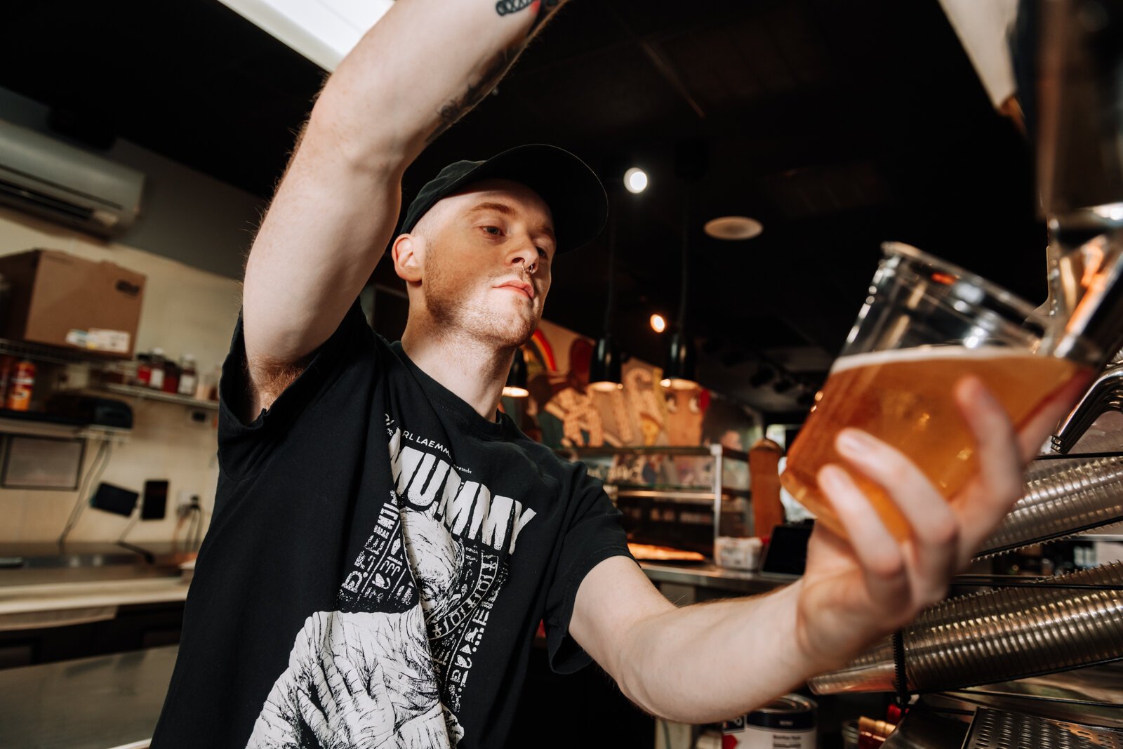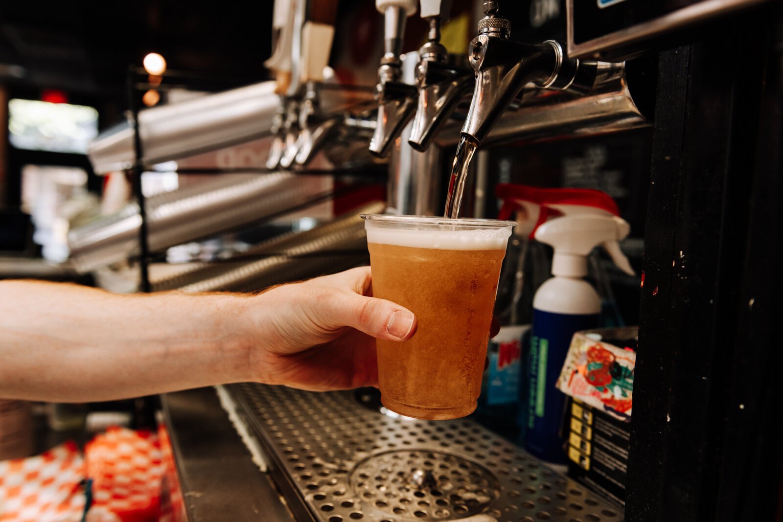 Pint & Slice Manager Tristan Wright pours a Miller Lite. Pint & Slice is one of several businesses that will participate in the Downtown DORA.