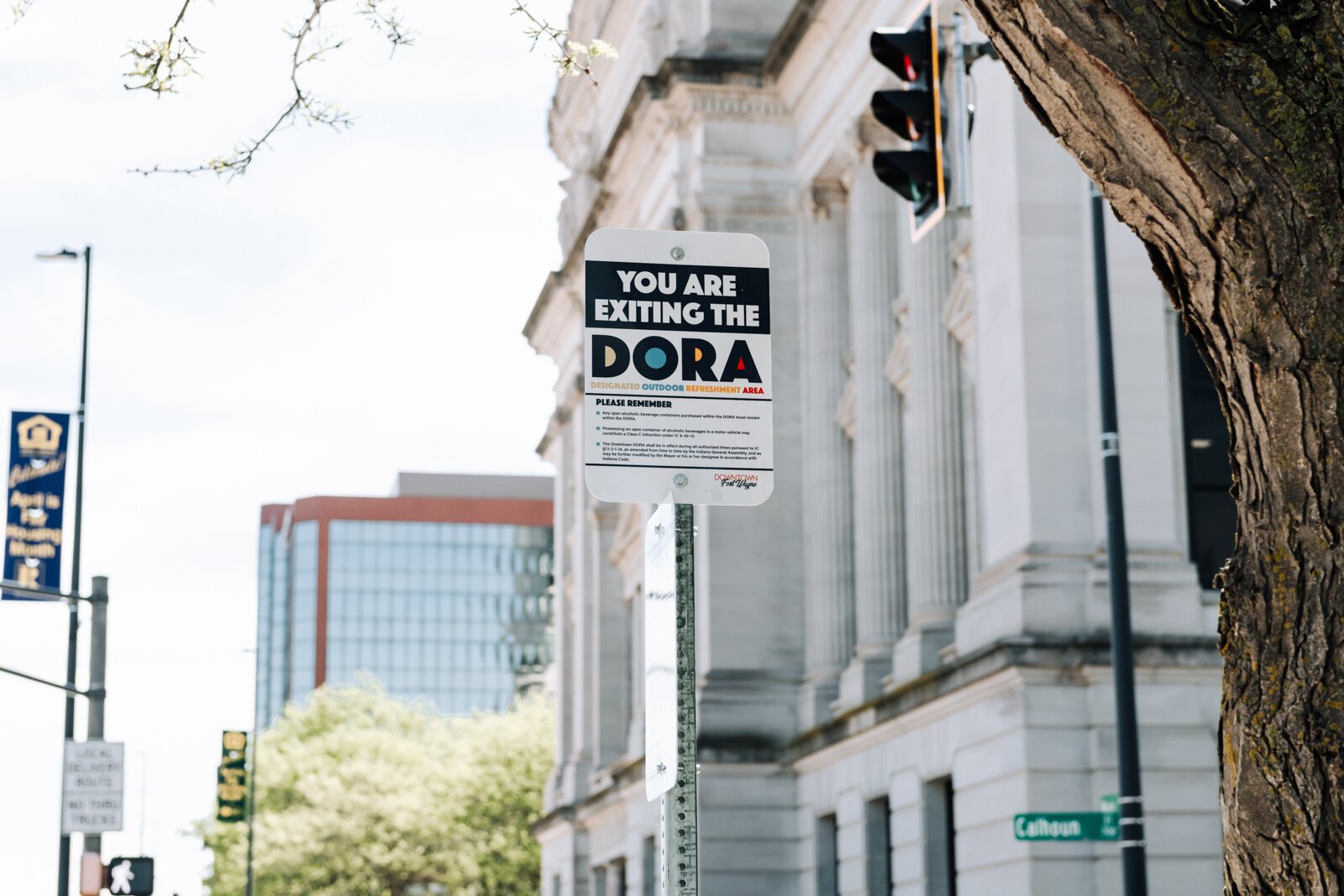 Rachel Von Art LLC – A sign at Main Street and Calhoun Street reminds people of the rules within the new Downtown DORA (Designated Outdoor Refreshment Area).