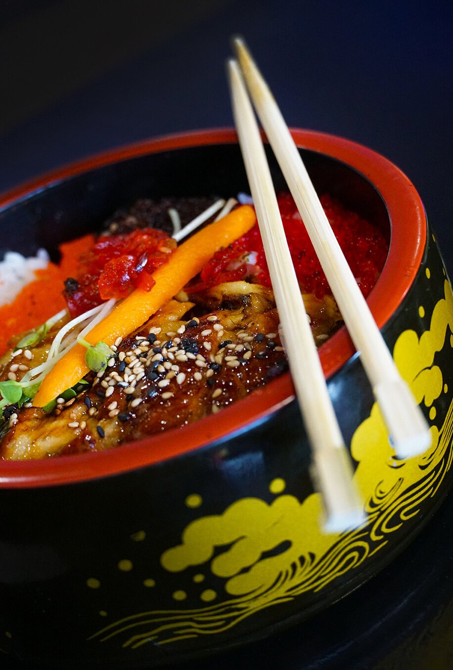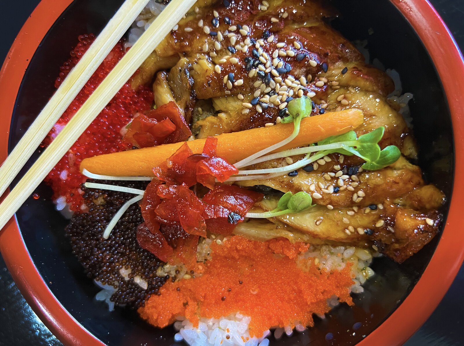 Last to the table is the unagi donburi, which is presented beautifully with colorful sections of eel, tobiko, and masago placed over subtly seasoned rice. The tender eel slices are rich and coated in a sweet, savory sauce. The furikake, tobiko, and masago add a flavor that’s deeply oceanic and sensational—with explosive pops of roe.