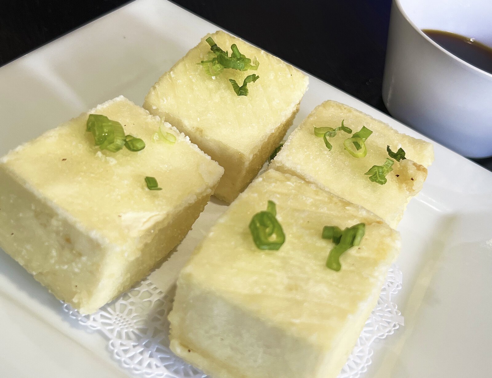 I’ll admit I’m a geek for happy-hour culture or any tradition that brings people together for social grazing. With my enthusiasm in tow, I order the agedashi tofu from the izakaya menu first. The tofu is served in thick squares encased in a fried, but delicate outer ridge. The texture is dynamic, with a wafer-like crisp on the outside and a soft, custardy center. Unlike custard, this dish is deeply savory with a dashi-soy-based dipping sauce that packs a balance of brightness and umami into each bite.