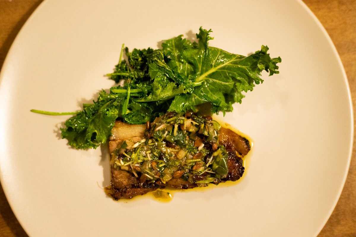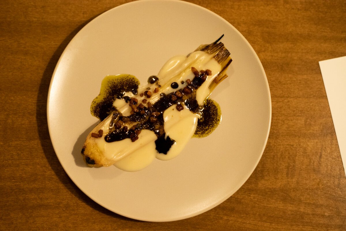 A smothered, blackened leek is the focal point of the third course. The leek is tender, grassy, and sweet with brown, caramelized ridges. Covered in a velvety, unctuous roux and topped with crispy bacon lardons, this dish evokes a French vibe. It’s savory with the proper amount of indulgence in every bite.