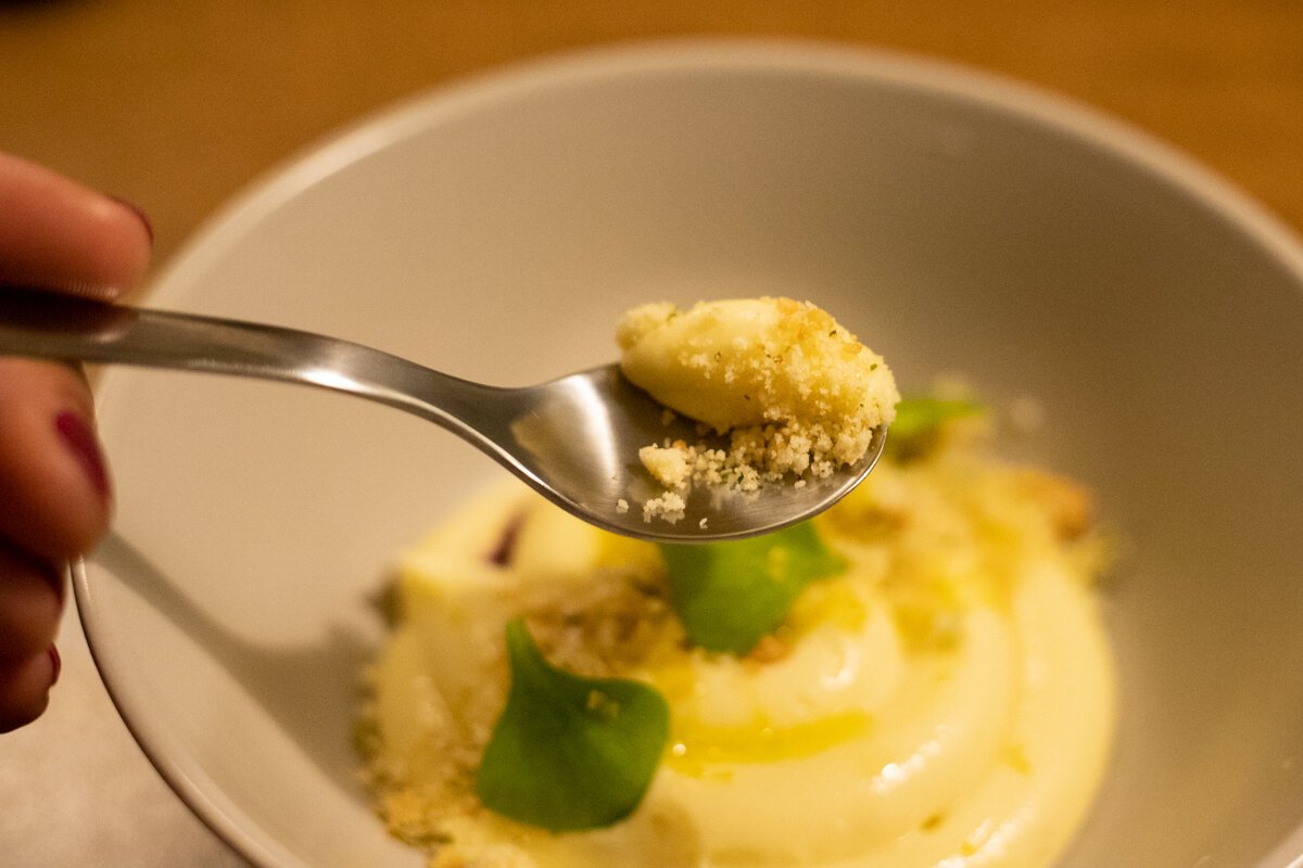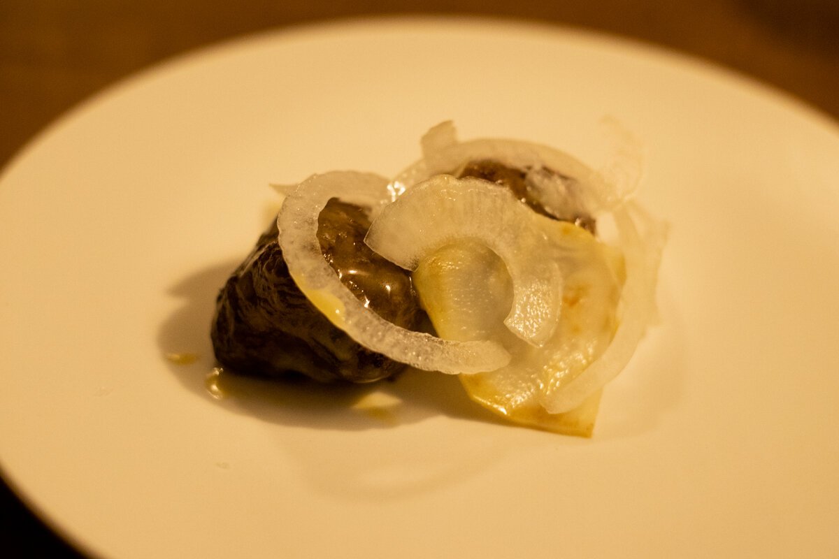 The fourth course presents sunchokes in the style of a familiar finger food, like a boneless wing or a meatball. The sunchoke’s caramelized edges are dressed in a sweet-savory honey mustard glaze and provide a nice contrast to its spongy, chewy center. It’s paired with vinegary celeriac and slivers of raw onion that both provide a sharp and refreshing crisp.