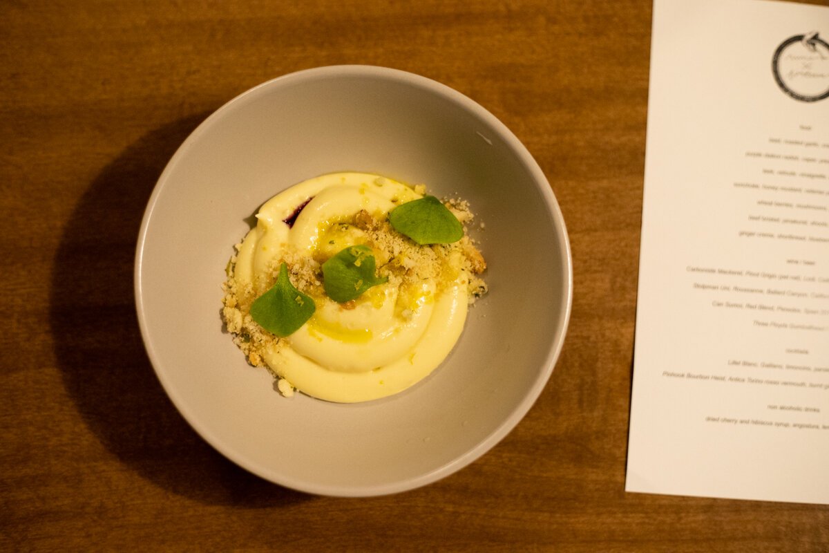 The last course features a dessert creme that’s complex with tart berries, bright ginger, a swirl of slick olive oil, a buttery shortbread crisp, and a fair amount of salt—adding a semi-savory element, which allows all the flavors to pop. The claytonia garnish lends a nice splash of color and a subtle freshness for a well-rounded dessert.