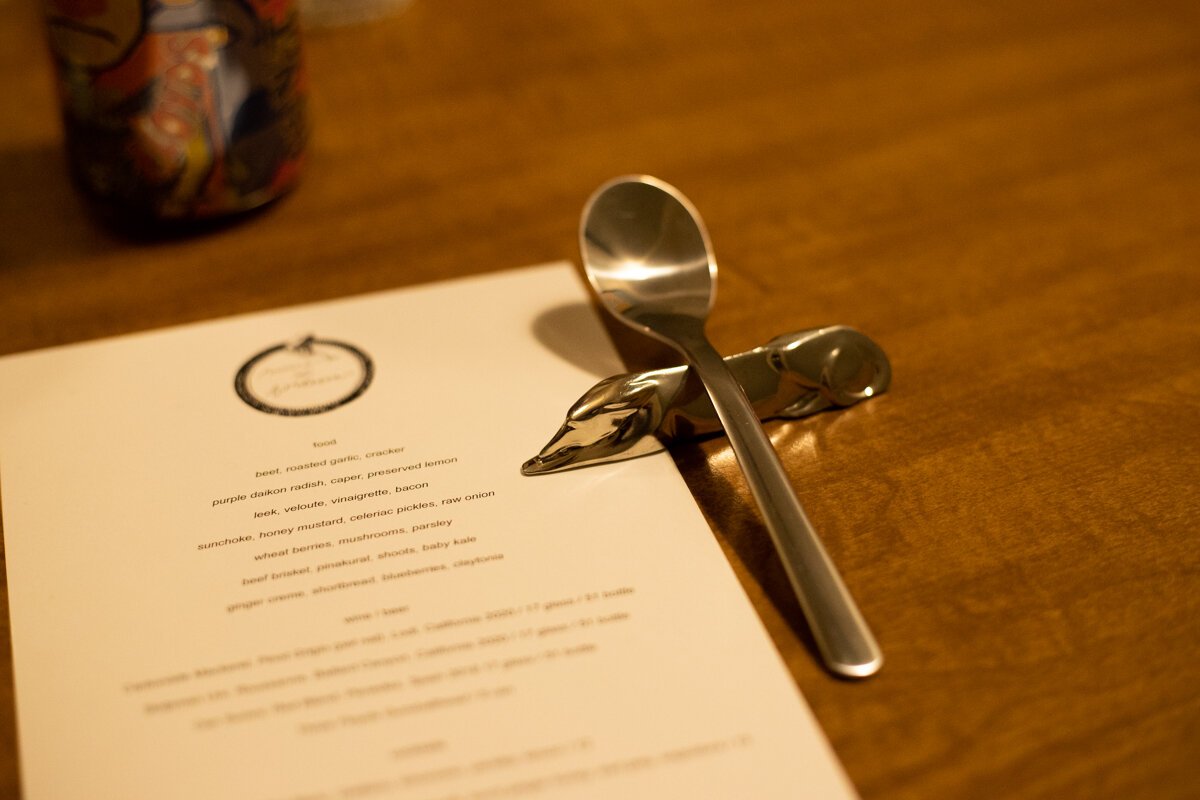 Studying the details, there’s an air of sustainability at Rune, though I can’t say for certain if that’s Chef Richardson’s intent or my own interpretation. Our table is equipped with a menu describing the thoughtfully curated tasting, along with upcycled touches, like water pitchers made from mezcal bottles and vintage animal-shaped spoon rests.