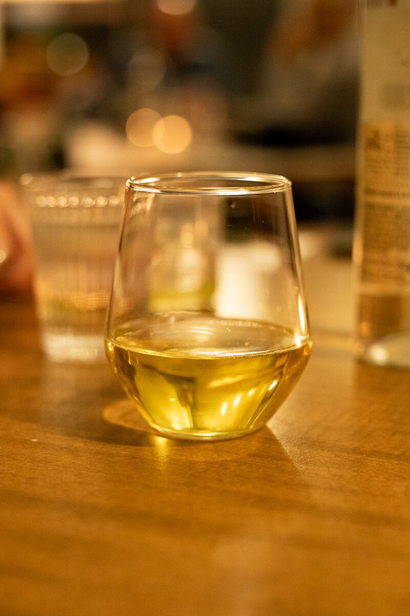 My cocktail arrives first, containing Lillet Blanc, Galliano, limoncino, parsley, and lemon. It radiates an electric shade of chartreuse, and it tastes just as bright. It’s slightly sweet with notes of anise thanks to the Galliano. It’s not over-the-top, providing a refreshing aperitif to sip between courses.