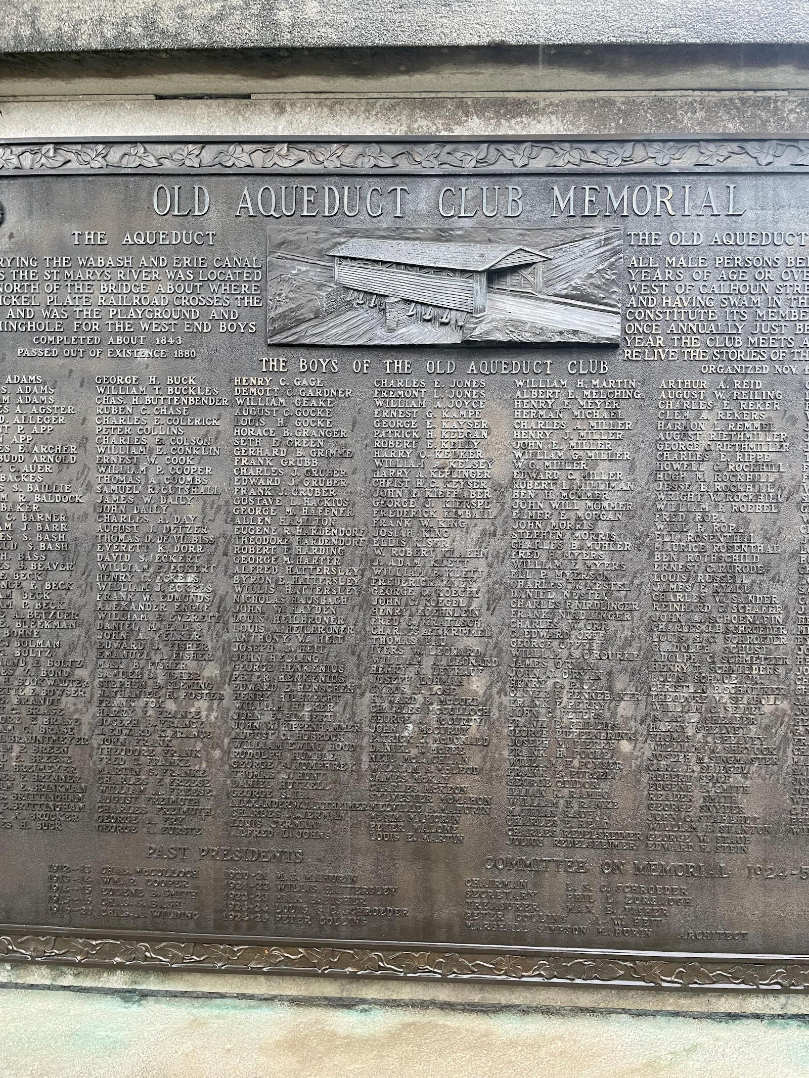“OAC members” refers to the “Old Aqueduct Club,” an informal group of boys in West Central who used to swim in the Wabash-Erie Canal aqueduct on the St. Marys River. The club erected the “Let’s go Swimmin’” monument in Orff Park, near where the old aqueduct once ran.