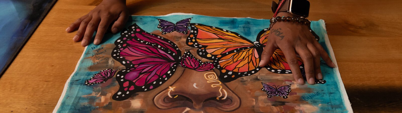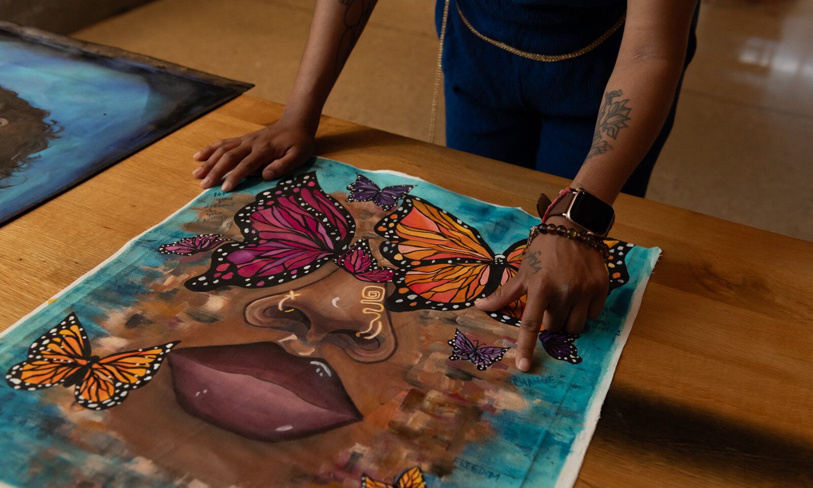 BonJo points out details in her self portrait.