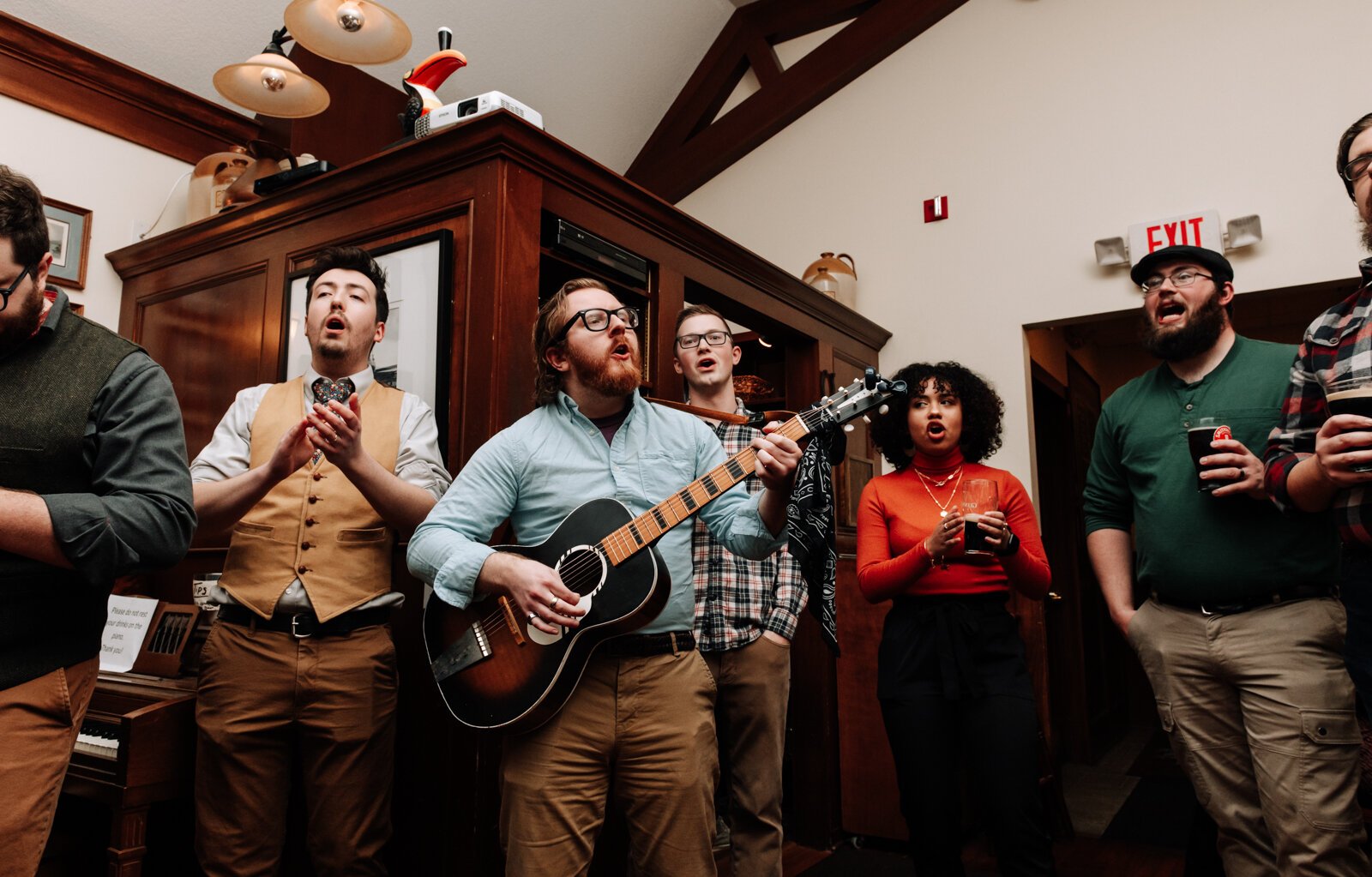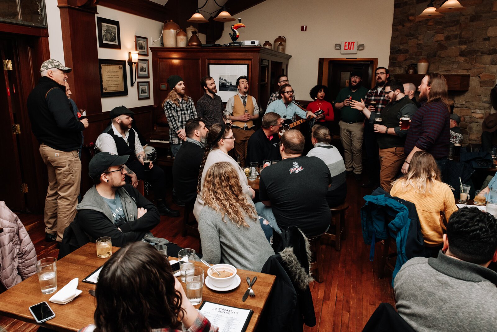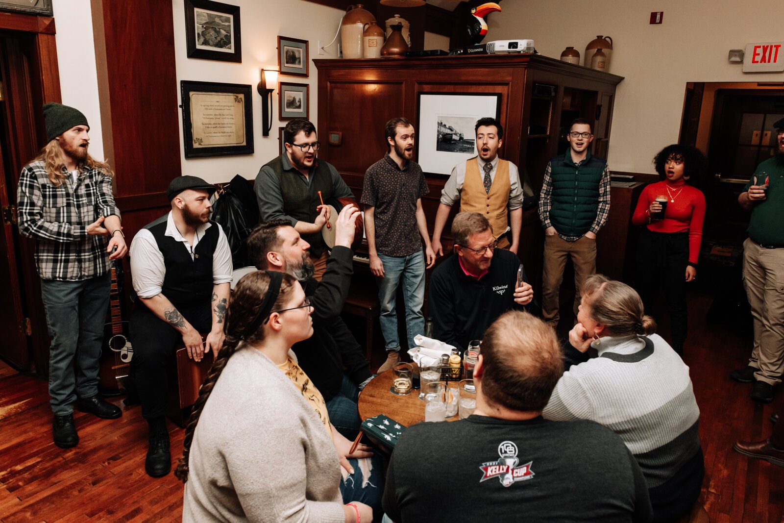 On the last Thursday night of every month, just inside its backroom known as Beleek Hall, this motley crew of 20- and 30-something friends gathers ‘round an old wood piano near the fireplace. Some carry instruments – a guitar, a banjo, a mandolin, a bodhran. And with the strum of a guitar, someone belts out: “One, Two, Three!”
