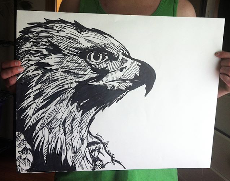 As for the eyesight … even if I draw something pretty realistic like an animal … I will focus on a really small area, and I just keep drawing, and I won’t look at the whole until I finish and it’s in proportion. So because of my eyesight (I have no peripheral vision), I tend to focus on a teeny area and not look at the whole. So it all works together.