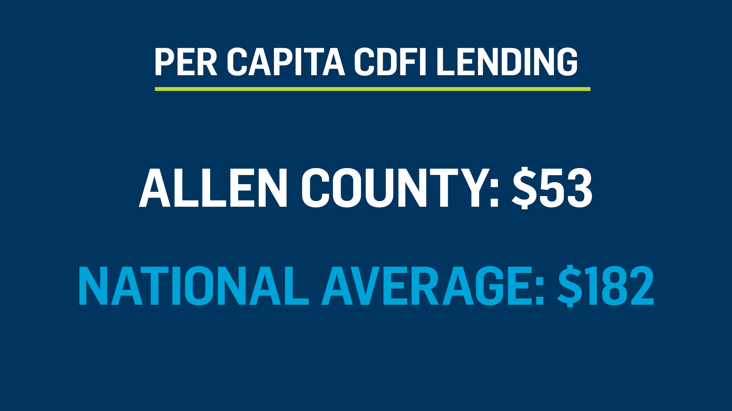 Fort Wayne has gaps in access to capital that need to be addressed, too, as evidenced by a Phase-1 study from CDFI Friendly America. The study showed local CDFI lending activity in recent years is just 30 percent of the national average, says Ellen Cutter, Chief Economic Development Officer for Greater Fort Wayne Inc.