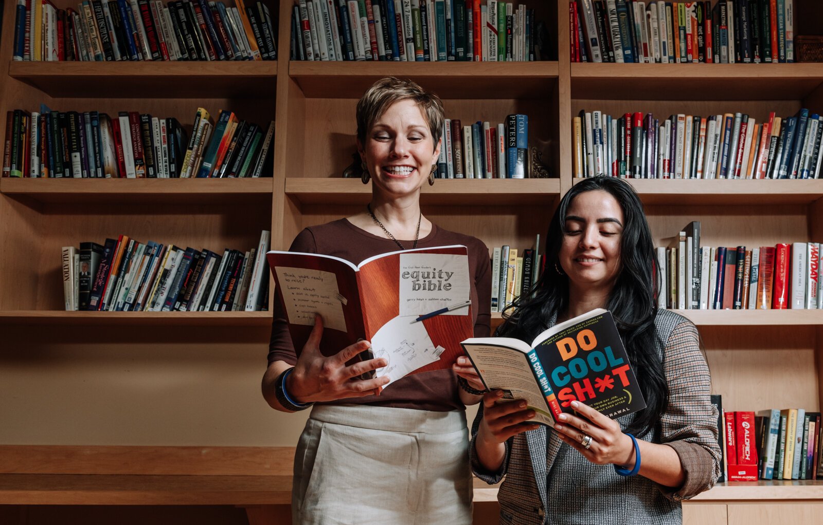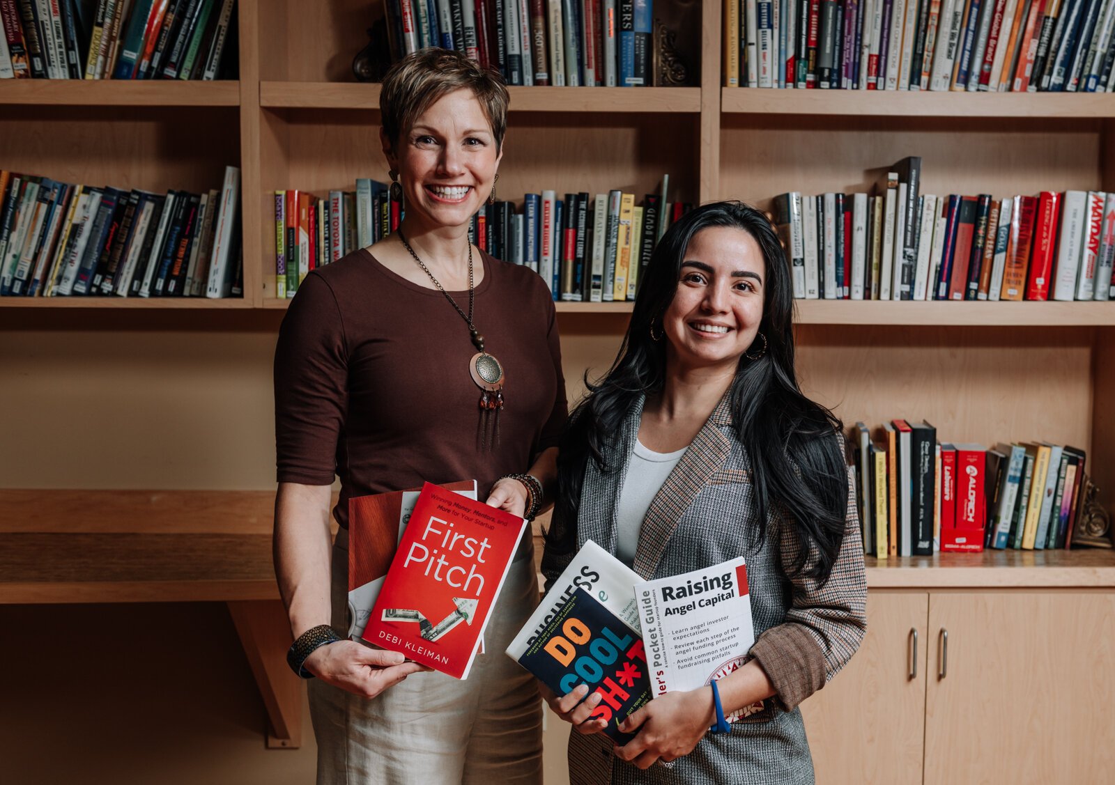 Leslee Hill, left, Program Director and Rosalina Perez, Program Manager at WEOC Women's Business Center show off business books at the Northeast Indiana Innovation Center.
