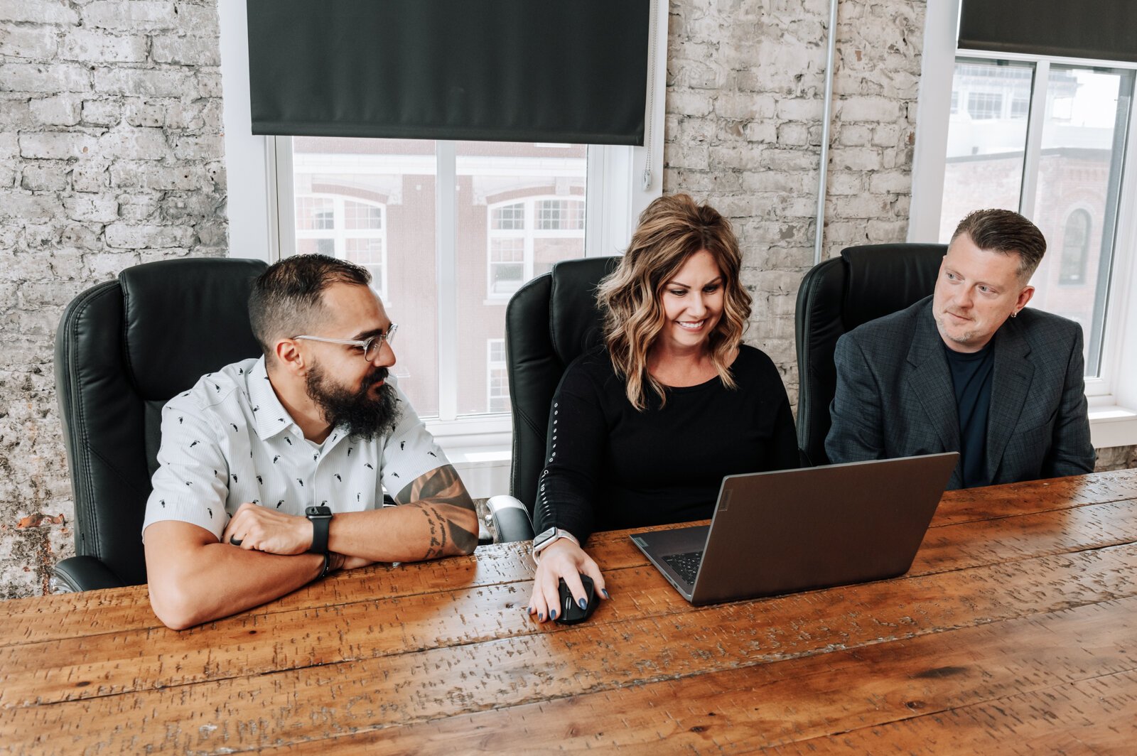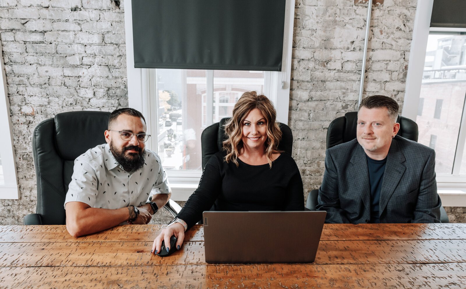 Team members from left: Jason Mullins, Sarah Winling, and Jeremy Winters work together.