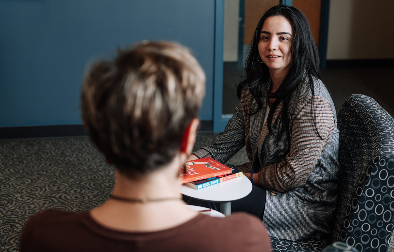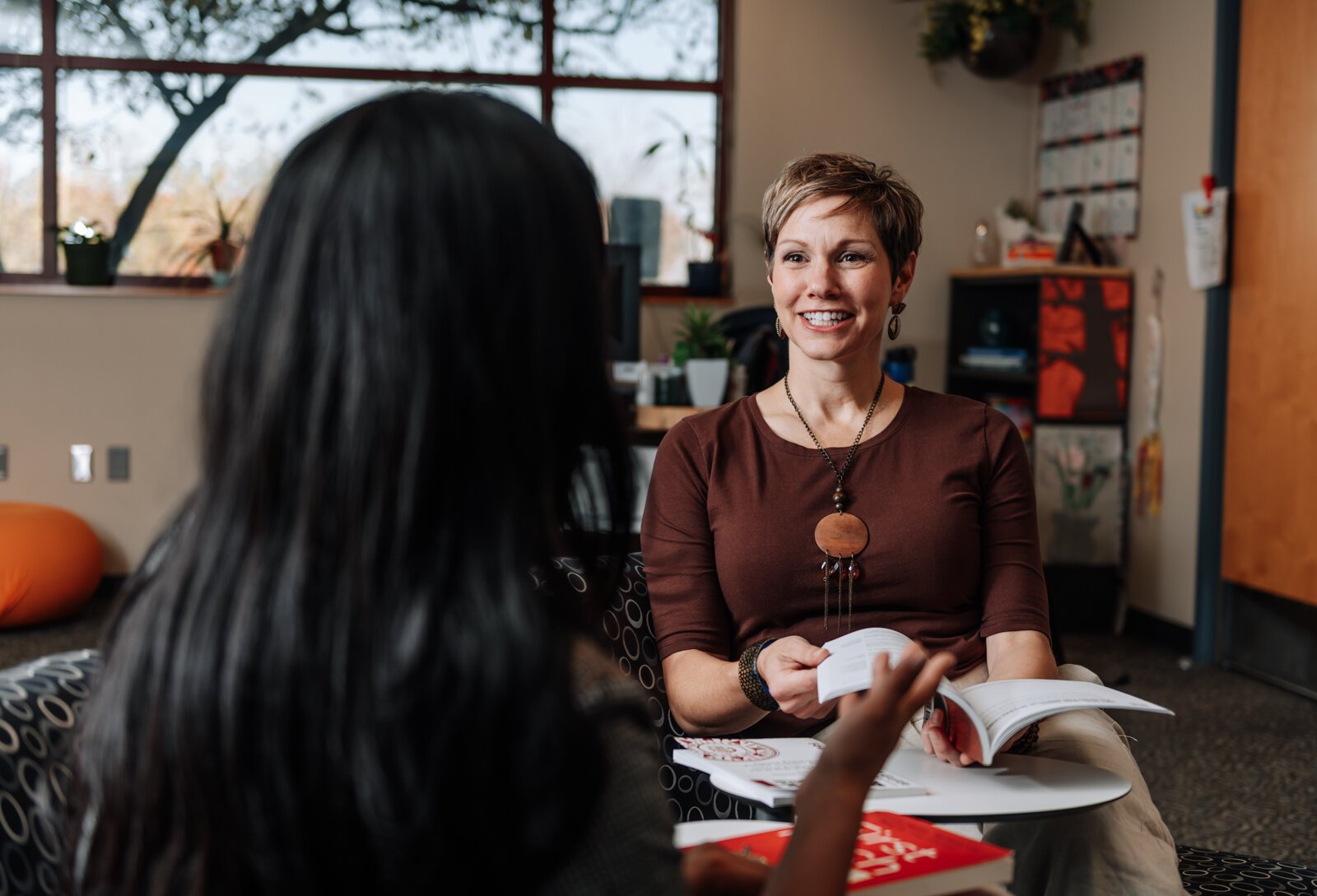 Leslee Hill, right, Program Director talks with Rosalina Perez, Program Manager during a meeting together at WEOC Women's Business Center at the Northeast Indiana Innovation Center.