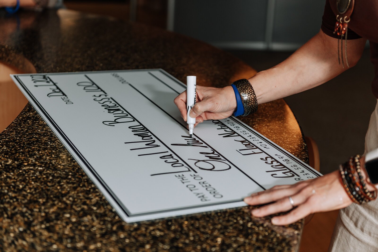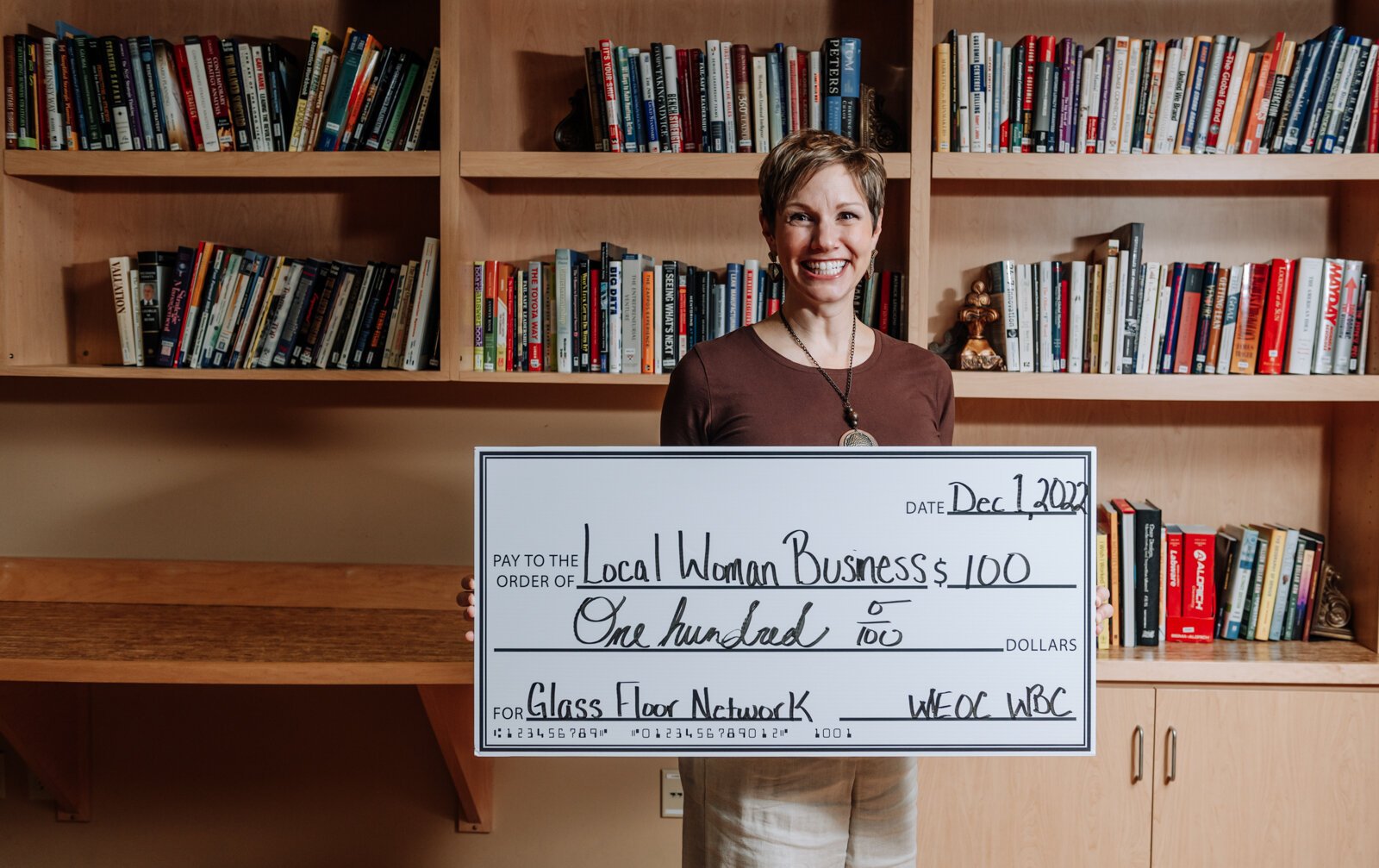 Leslee Hill, Program Director at WEOC Women’s Business Center shows an example of a donor check for local women business at the Northeast Indiana Innovation Center