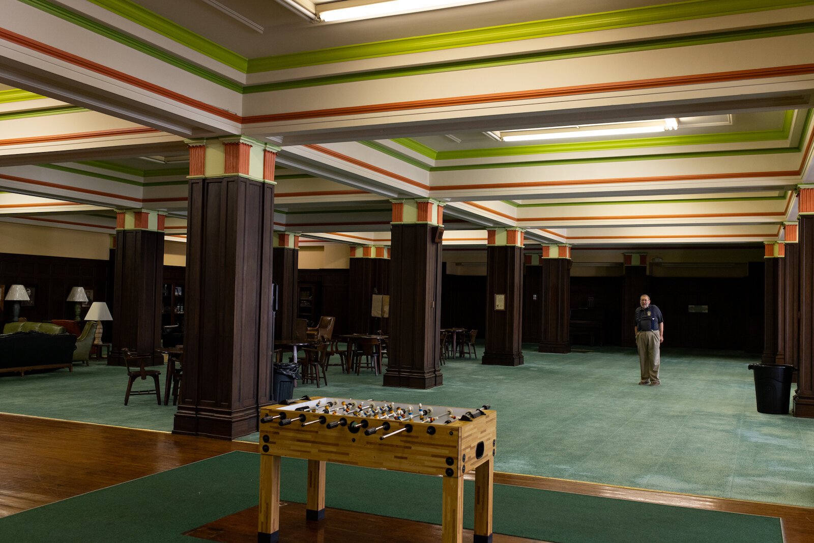 Along with the Ballroom, you can rent the Hall’s second-floor Social Room, which formerly functioned as an exclusive gentlemen’s club for the masons, with pool tables, foosball tables, high back chairs, and flatscreen TVs.