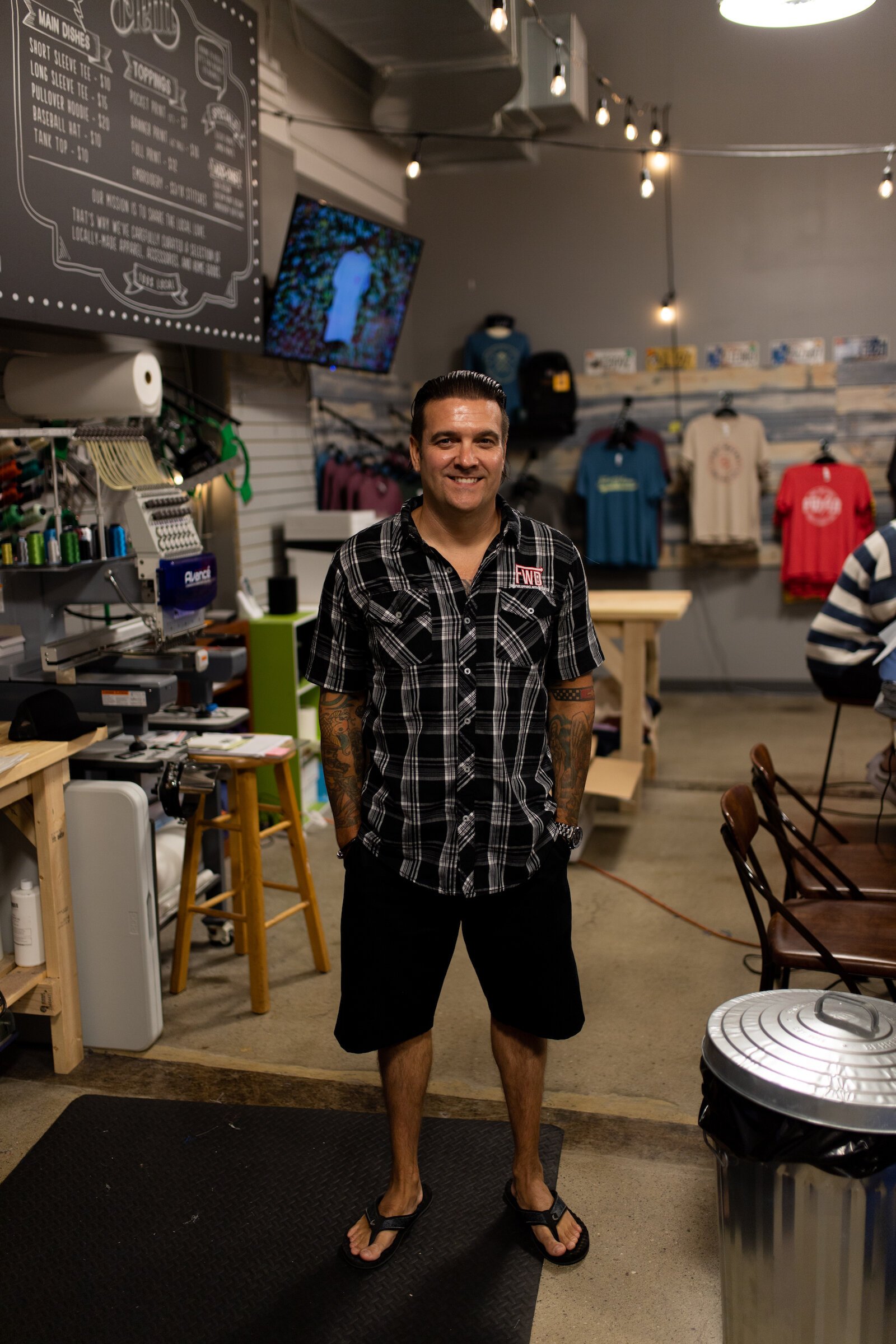 Down the hall and to your left, you’ll find an entire retail floor of direct-to-garment digitally printed apparel, home goods, and accessories—all designed and made-in-Fort Wayne. This shop is First & Wilkerson Designs (FWD), and it’s locally owned by John Ambriole and his family.