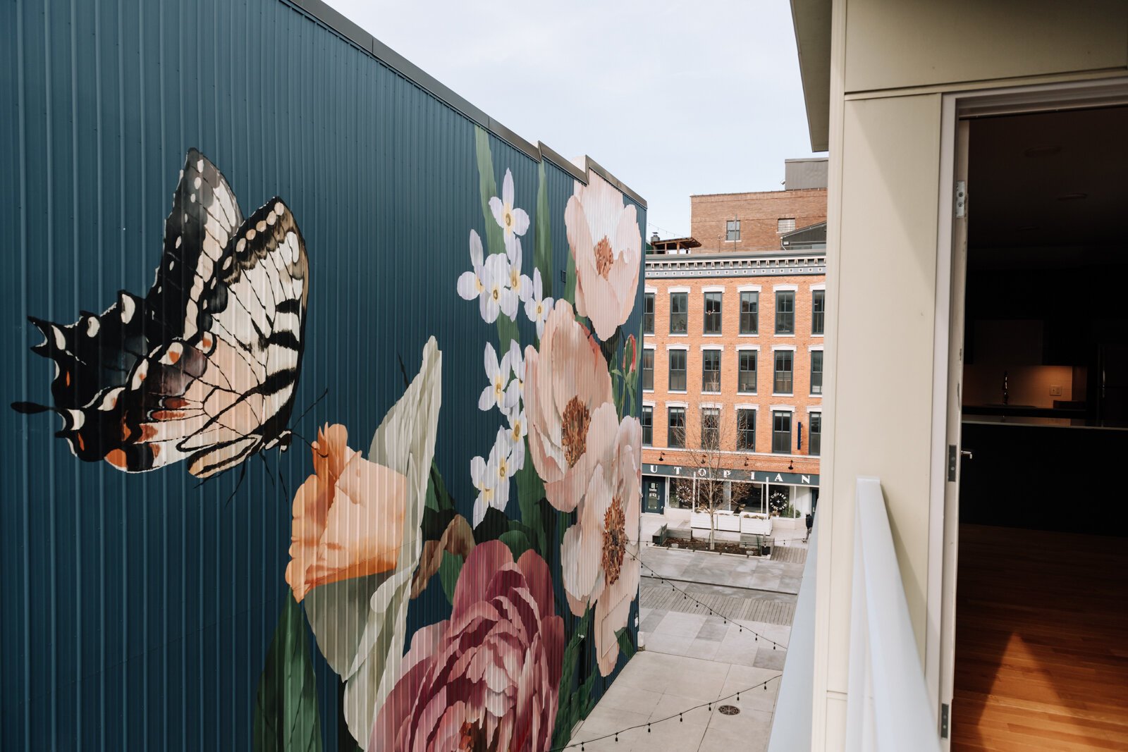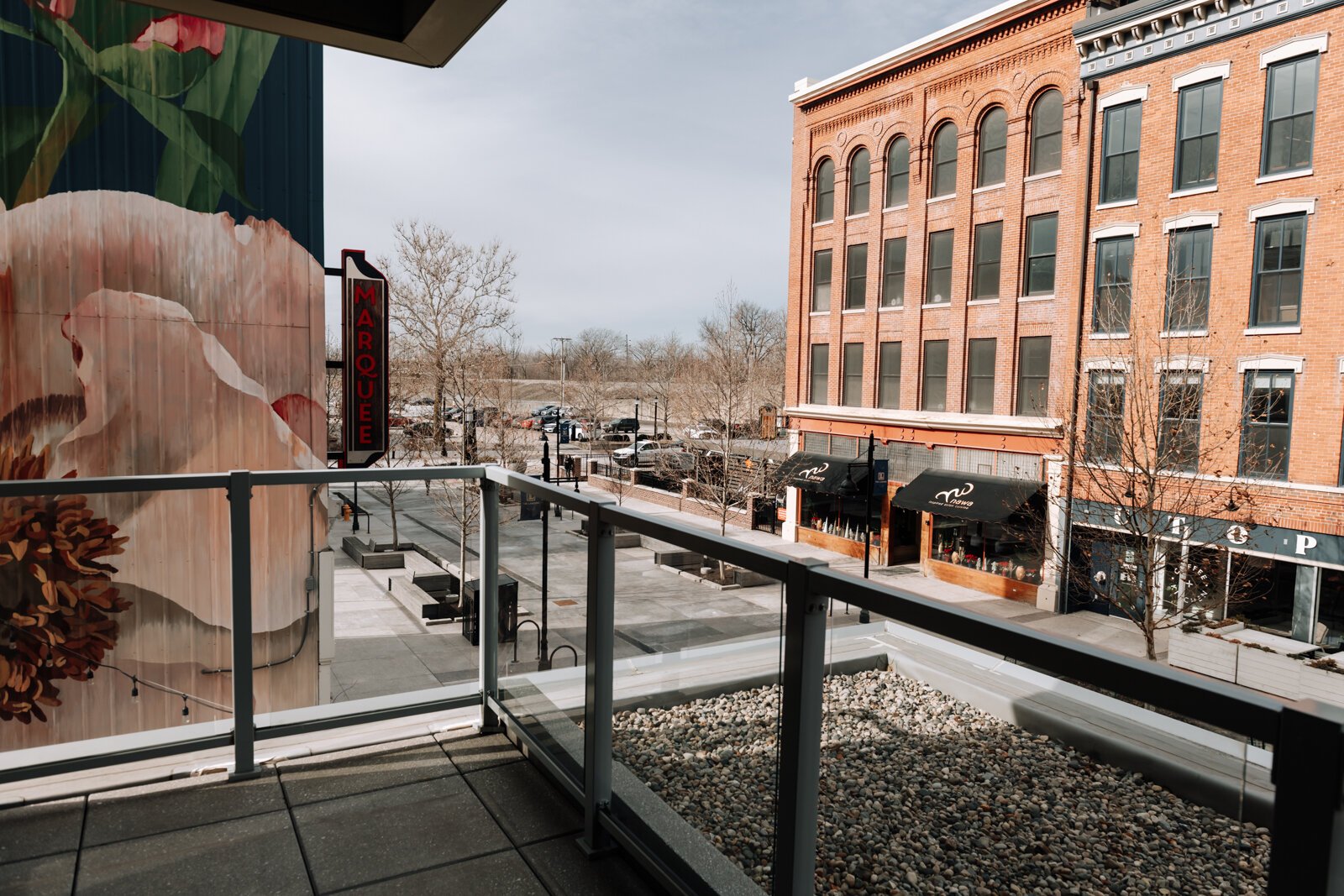 The balcony view from an affordable housing one bedroom apartment by Model Group on The Landing at 111 W. Columbia.