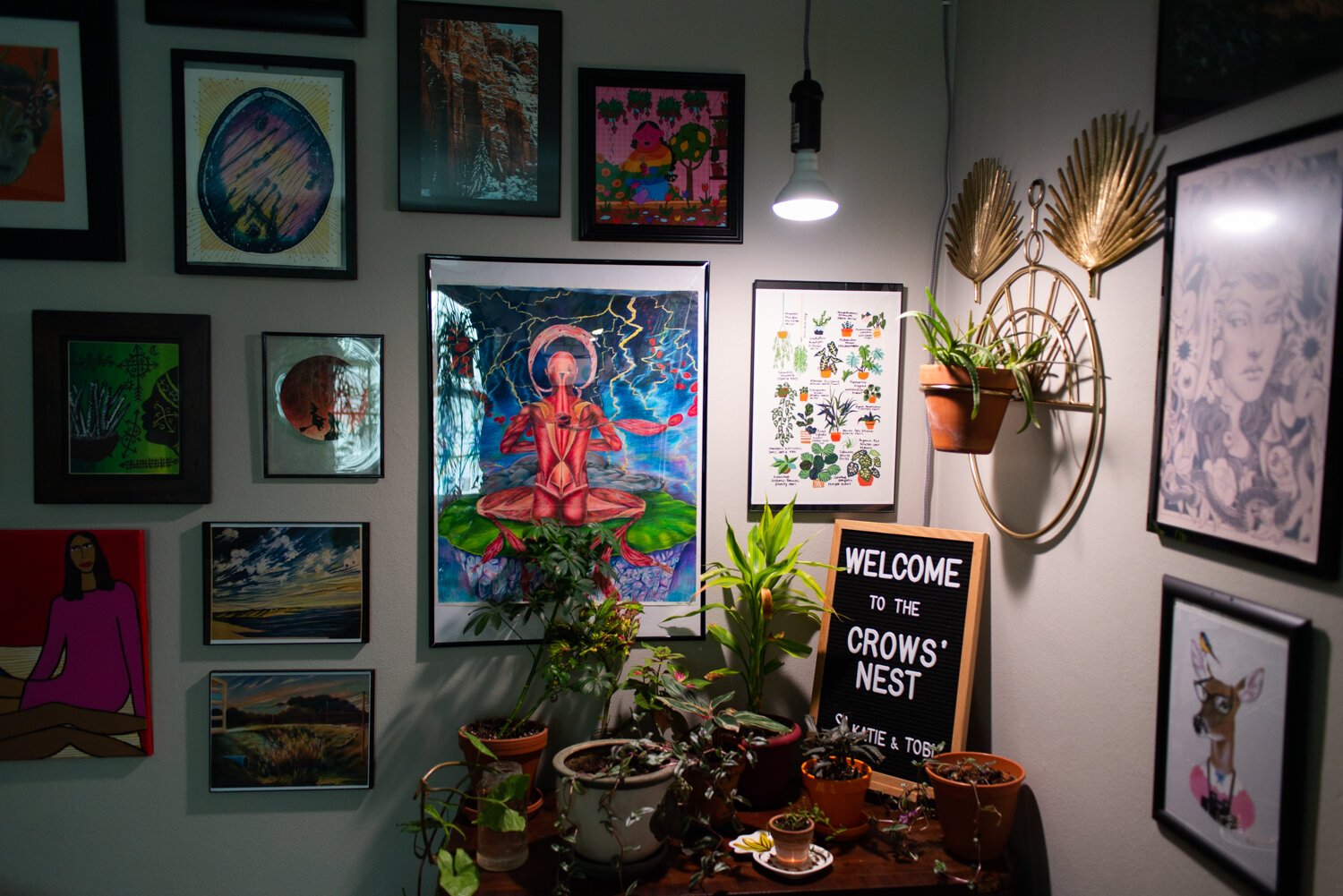 A variety of art, mainly from artists the roommates know, decorates the wall.
