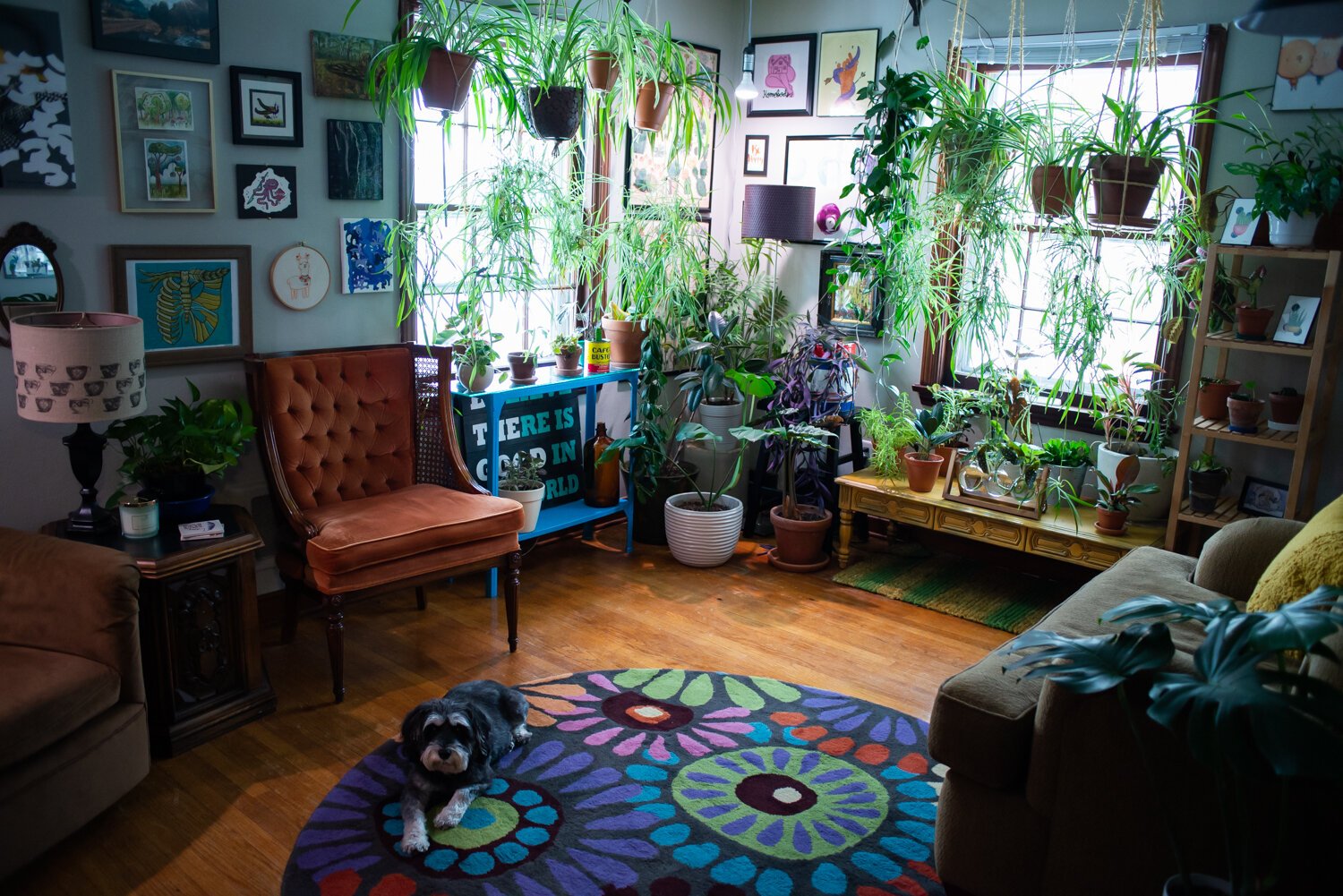 By Rachel Von Stroup – A variety of plants fill the living room as their dog Jake sits on the rug.