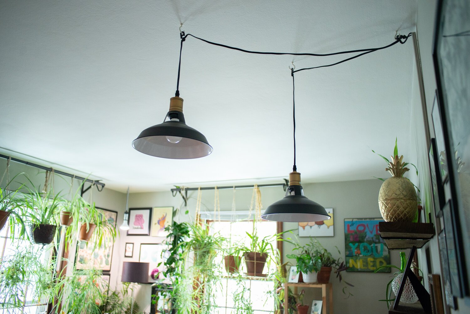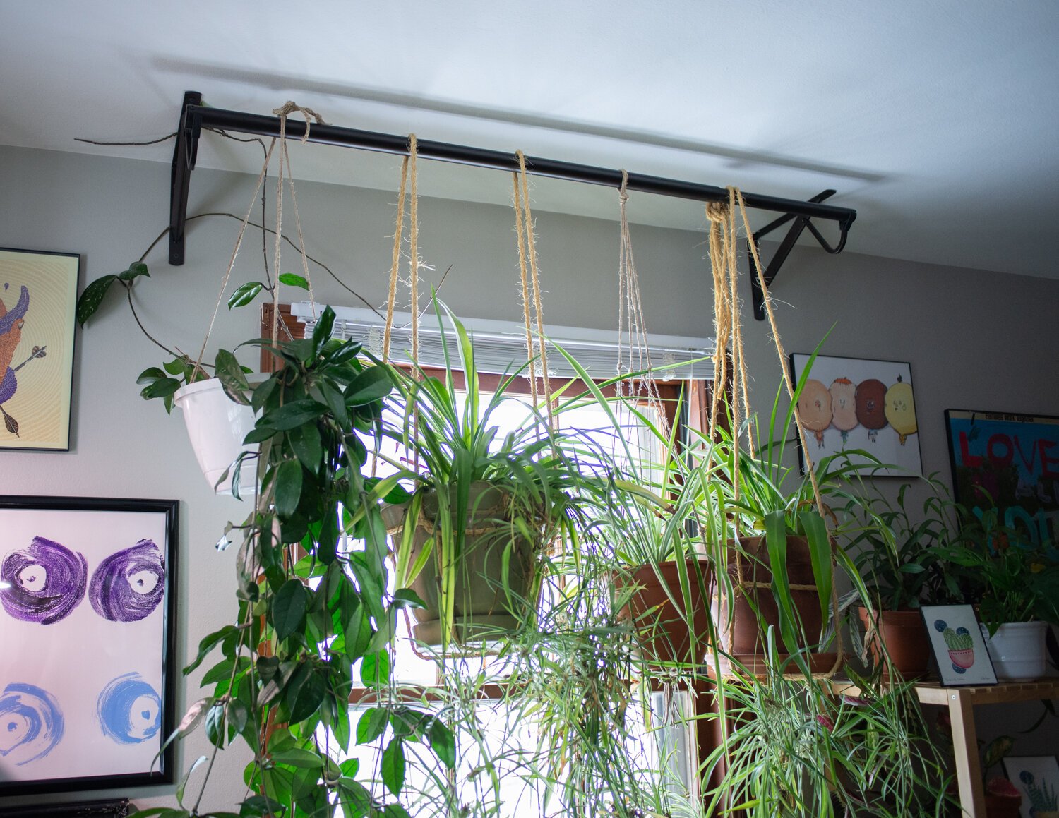 By Rachel Von Stroup – Plants are hung using extra support closet hangers in front of a window in their living room.