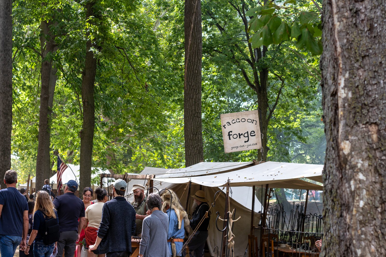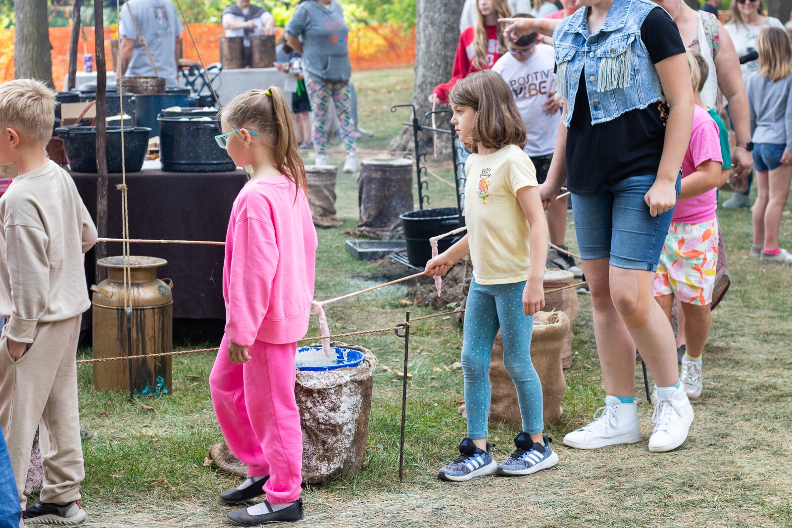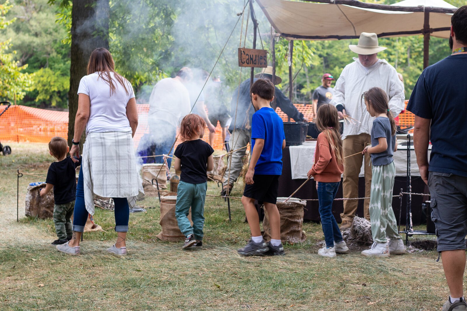 Children and their parents prepare to go for a ride on a homemade swing.Raccoon ForgeFestival attendees at a candle-making booth walk around in a circle, dipping their soon-to-be candles in wax and water repeatedly.People listening to time period tunes.Tending to the barrells used to cook fried pickles and onions.Festival attendees at a candle-making booth walk around in a circle, dipping their soon-to-be candles in wax and water repeatedly.People listening to time period tunes.A customer checks out with her pottery purchase.Passing by, people stop to record a musican performing.Festival-goers find their way through the crowded walkway.No modern conveniences are allowed, so booth workers must put in extra work to keep pots hot and food cooking.