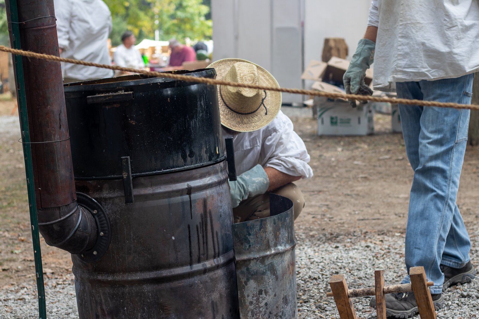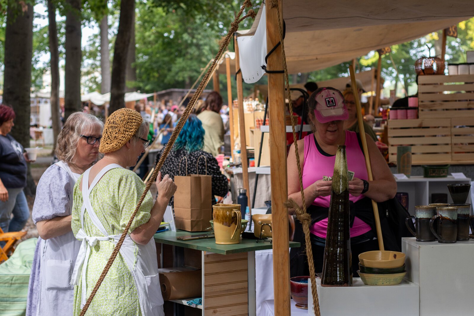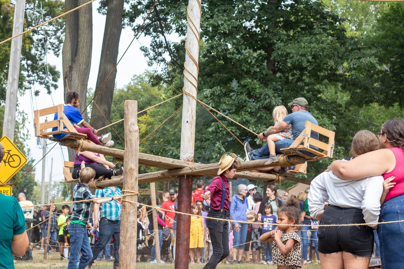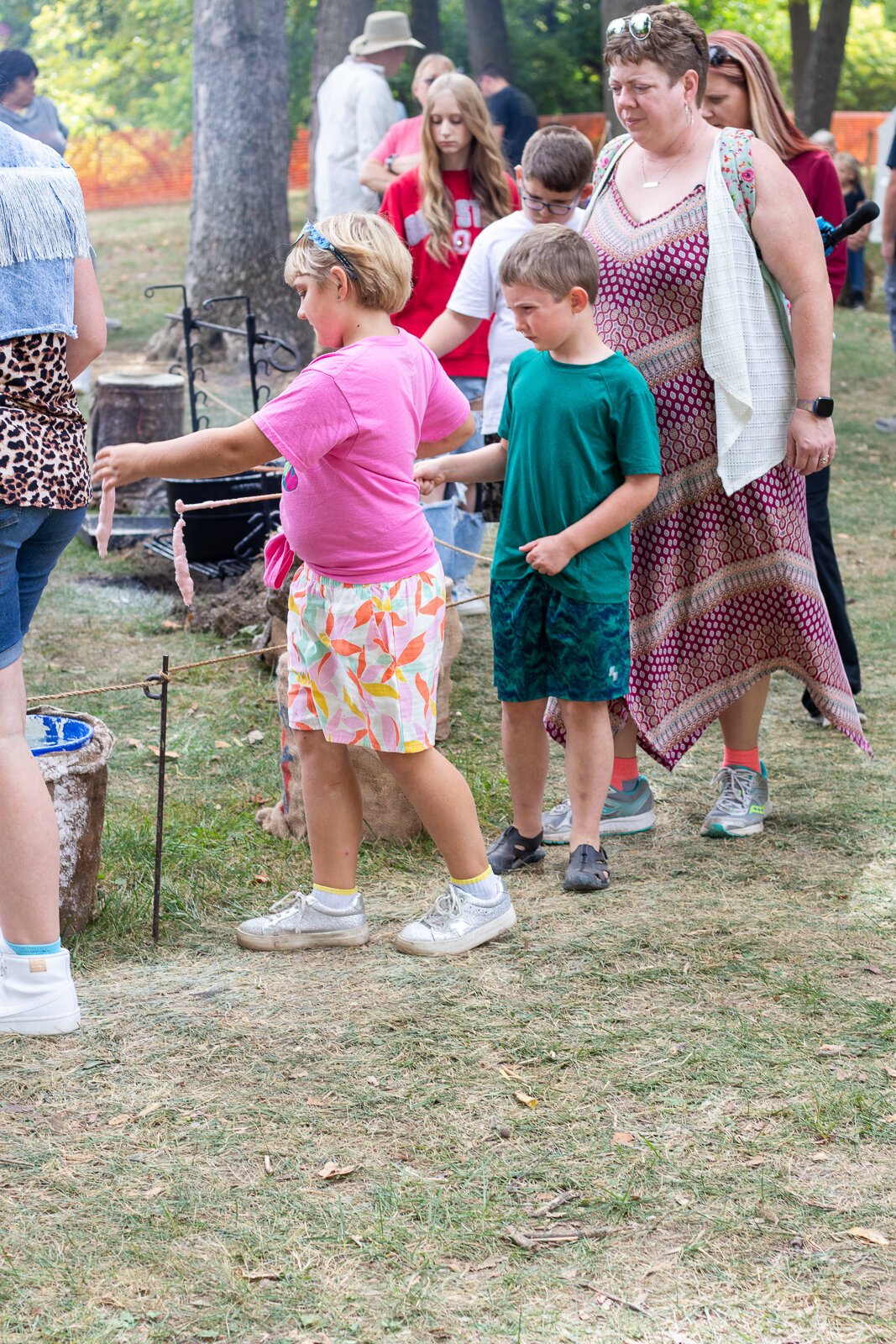 Children and their parents prepare to go for a ride on a homemade swing.Raccoon ForgeFestival attendees at a candle-making booth walk around in a circle, dipping their soon-to-be candles in wax and water repeatedly.People listening to time period tunes.Tending to the barrells used to cook fried pickles and onions.Festival attendees at a candle-making booth walk around in a circle, dipping their soon-to-be candles in wax and water repeatedly.People listening to time period tunes.A customer checks out with her pottery purchase.Passing by, people stop to record a musican performing.Festival-goers find their way through the crowded walkway.No modern conveniences are allowed, so booth workers must put in extra work to keep pots hot and food cooking.
