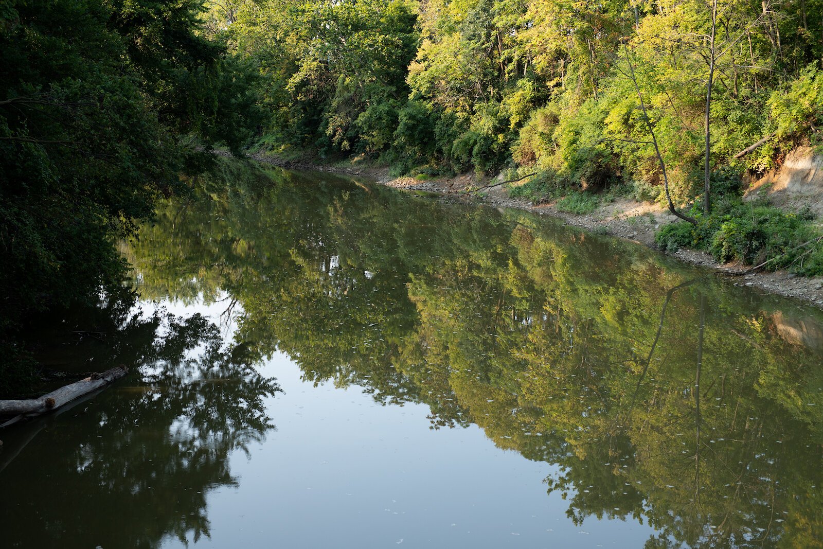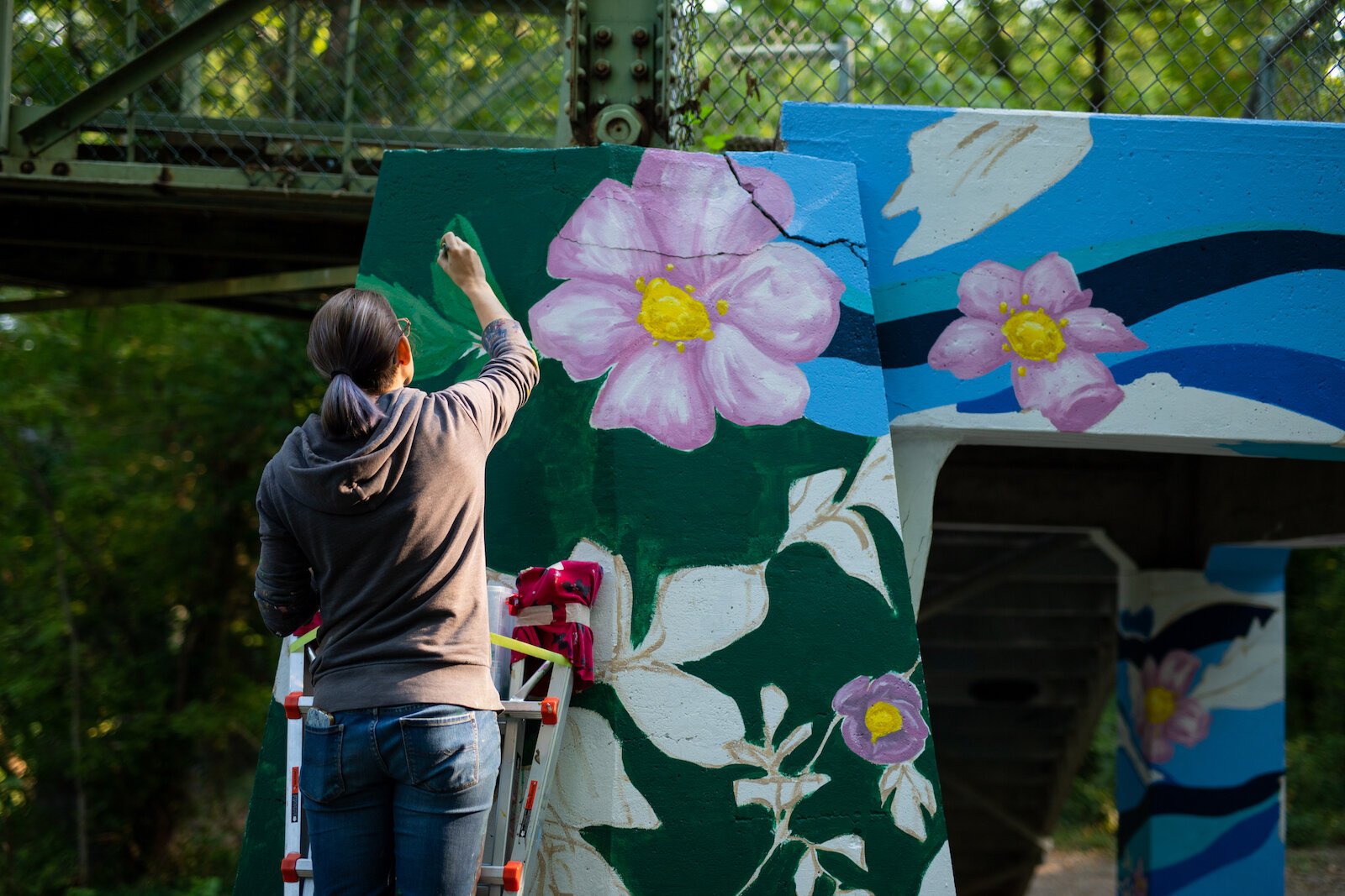 Built in 1920, the riveted steel towers of the bridge are supported by massive concrete footings. Now, thanks to Fort Wayne artist Suzanne “Suzi” Rhee, these drab footings have become an immersive, shady riverside mural, featuring native plants and wildlife.
