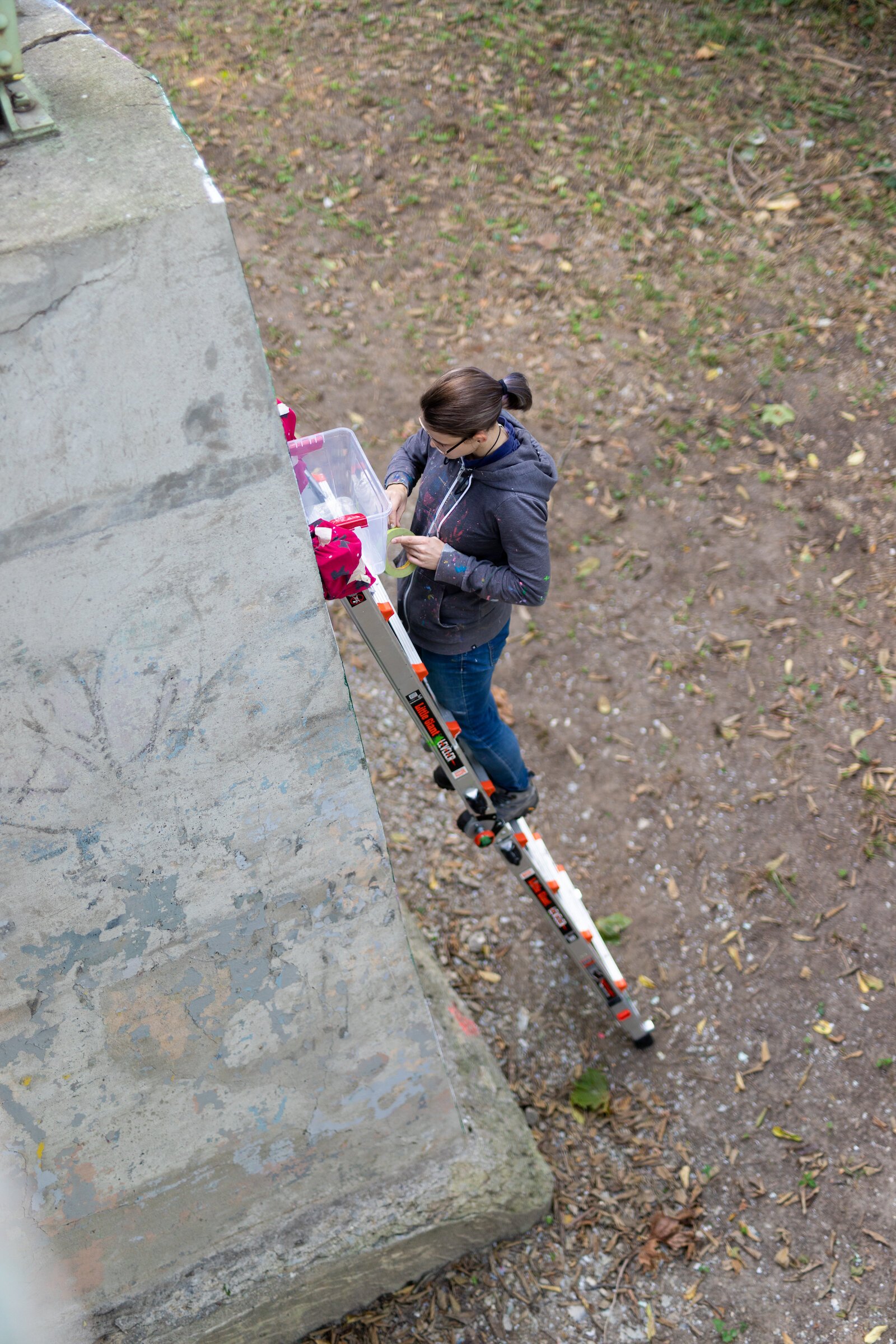 After my mural assistant experience in Columbia City, I found out about the Open Walls. I had two colors of exterior paint (leftover navy and white that we’d used on our garage the year before). I mixed those two to get a few in-between shades. On my days off, I painted monochrome pictures of a dog and an athlete. That’s what put me on Francisco’s radar.