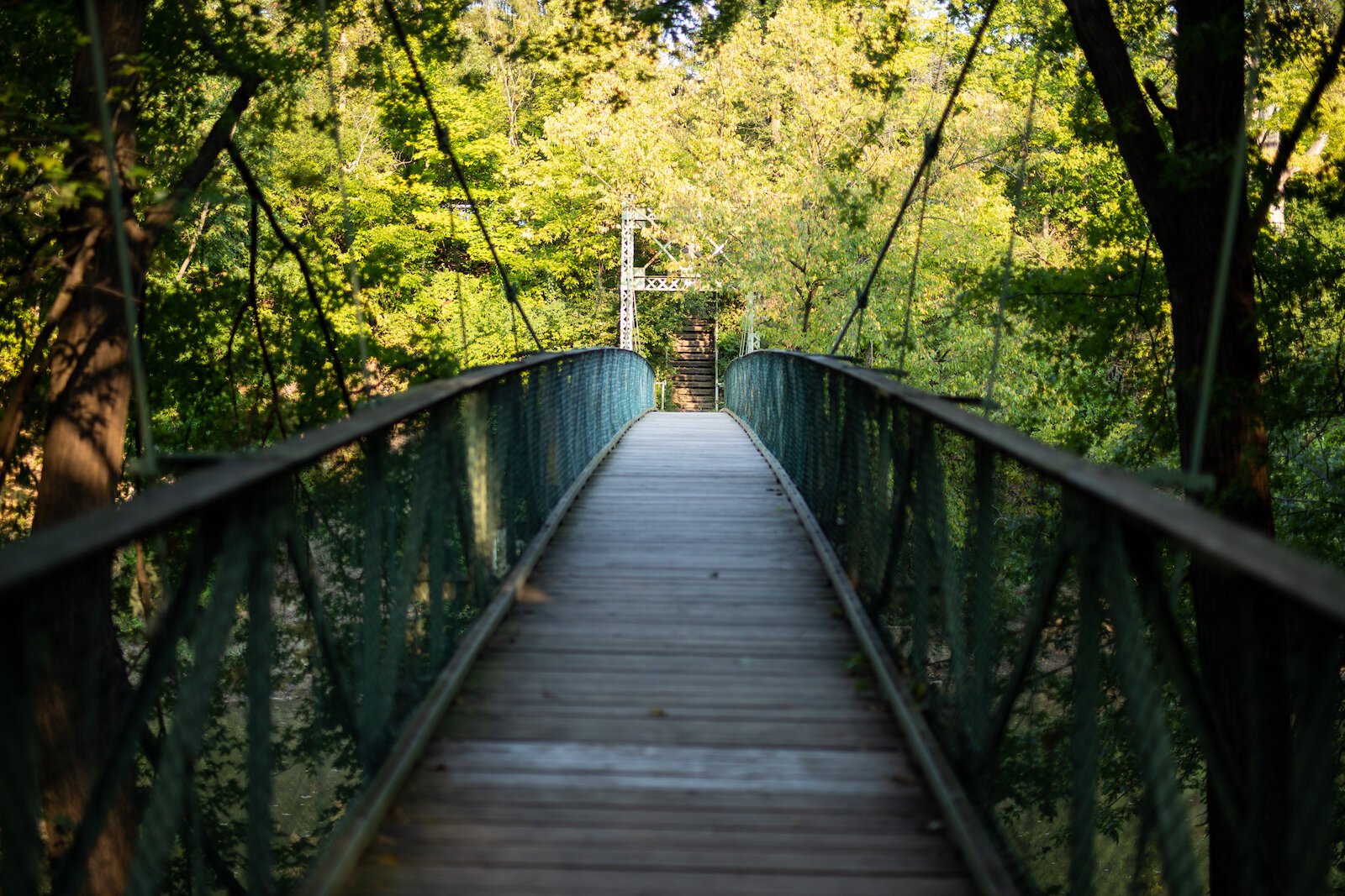 For most of the year, the suspension footbridge in Foster Park that spans the St. Marys River is hidden by a dense canopy of trees.
