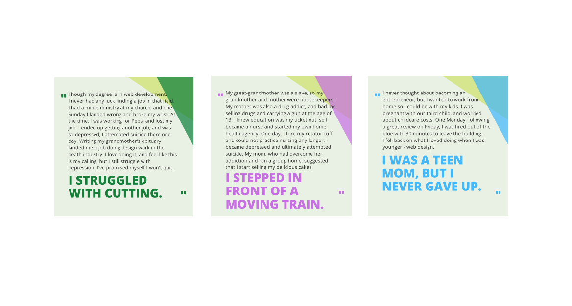 With permission, she summarized 13 anonymous stories from Own Your Success members in social media posts and released the series on Independence Day, raising awareness about the ā€œshove, struggle, overcomeā€ journey to business ownership.