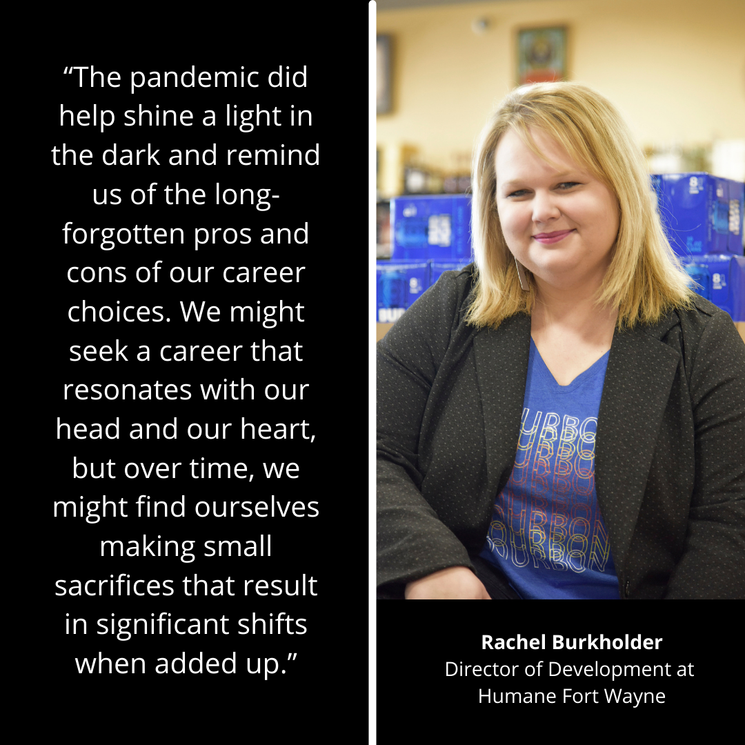Our professional careers are as unique as we are, and I hope that individuals can embrace their passions and find the right path in life. Life is short; take the leap; order the dessert; adopt the cat; ask to pet the dog. Find joy in doing something you love every day. And if you can’t find joy in your career, find it at home with your adopted pet from Humane Fort Wayne.