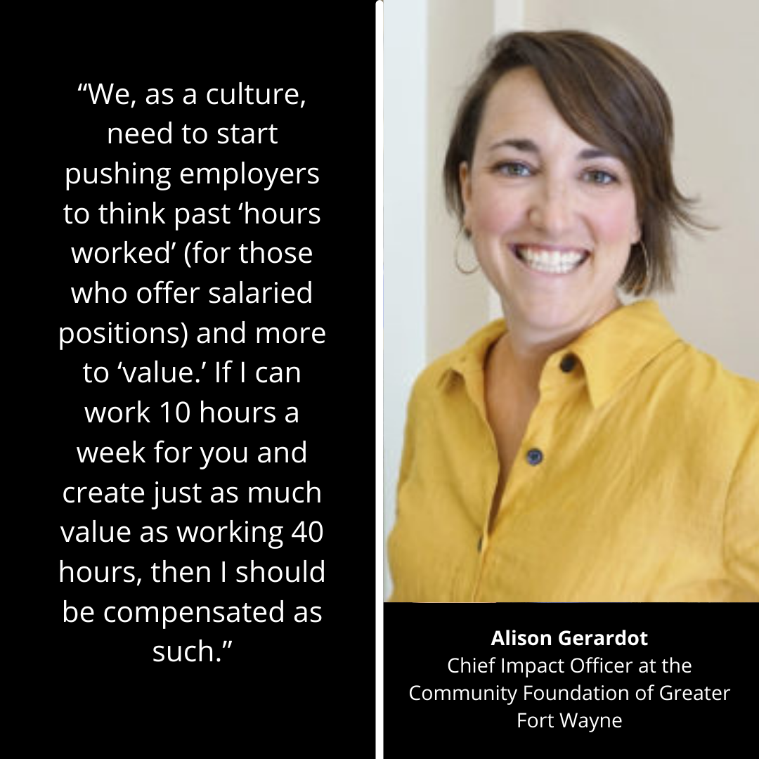 I would encourage anyone who is thinking about a change to make sure they really know and understand themselves enough to know what it is that they want and will be really good at. That’s not a job title, but it’s what your unique skill-set is. Use tools like Strengths Finder, DISC Assessment, etc. to really understand how you show up, and what makes you most fulfilled and then seek that out. Ask lots of questions in your interview. You’re interviewing the new employer just as much as they are interviewing you. And lastly, know your value. We, as a culture, need to start pushing employers to think past “hours worked” (for those who offer salaried positions) and more to “value.” If I can work 10 hours a week for you and create just as much value as working 40 hours, then I should be compensated as such.