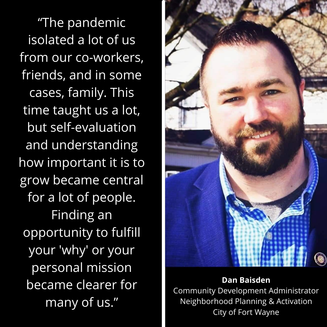 The opportunity to join the City and help lead a new dedicated workgroup focused on Neighborhood Planning and Activation is career advancement. It’s also a chance for me to put my area of expertise and passion to work for the citizens of Fort Wayne. I am a fan of Simon Sinek’s ‘Start With Why’ where you discover your core value, and mine was Public Service. I believe that if one thing the pandemic did for a lot of individuals in their existing careers, is it gave them an opportunity to seek what they are most passionate about. The pandemic isolated a lot of us from our co-workers, friends, and in some cases, family. This time taught us a lot, but self-evaluation and understanding how important it is to grow became central for a lot of people. Finding an opportunity to fulfill your ‘why’ or your personal mission became clearer for many of us.