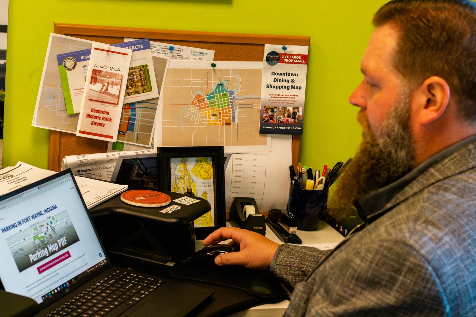 As Director of Operations for Downtown Fort Wayne, Howard hosts monthly parking meetings for representatives from several Downtown entities. They discuss parking challenges and adjustments due to upcoming events, festivals, developments, or road closures. They even update a free printable parking map of Downtown each month, courtesy of Visit Fort Wayne. The map shows 25 public parking garages and lots clearly marked and scattered throughout Downtown. It lists prices and hours for each location, most charging $1 an hour with a daily max of less than $10.