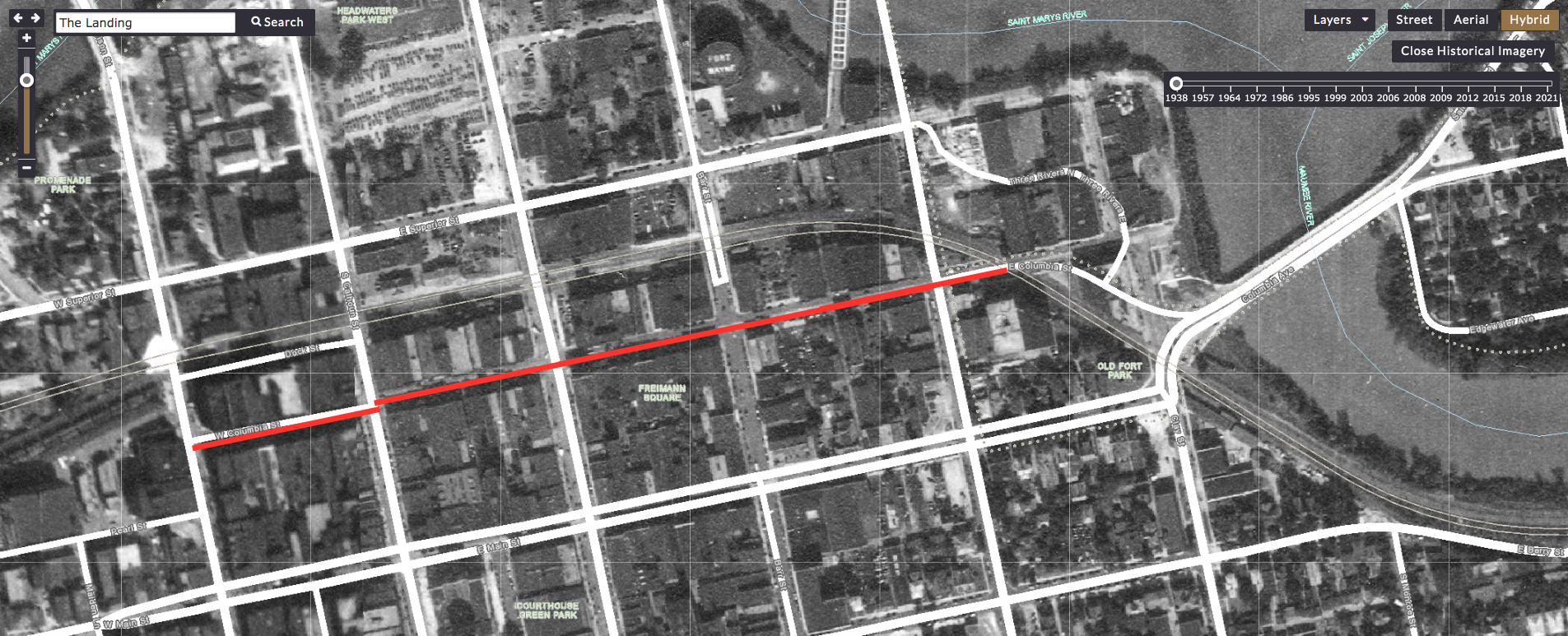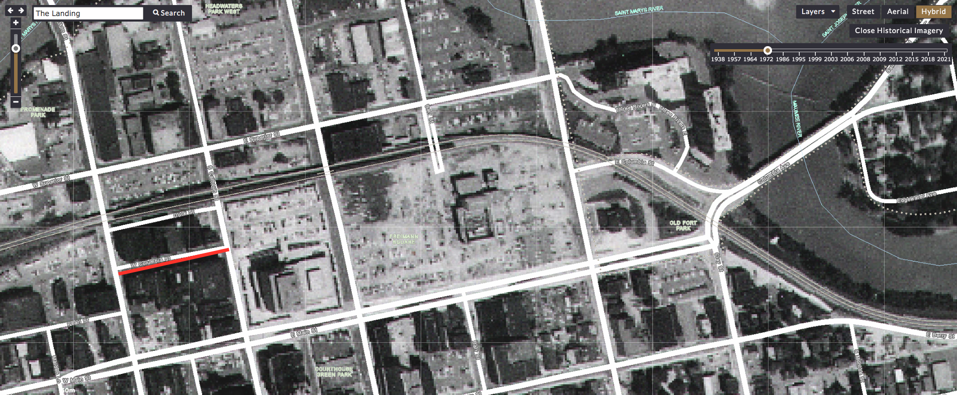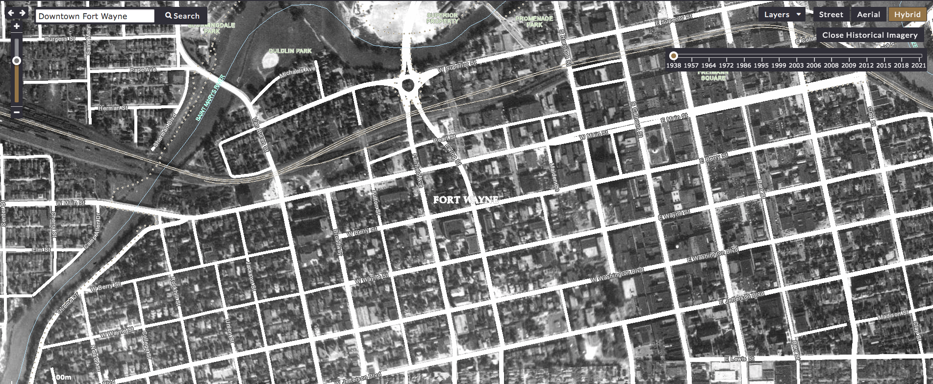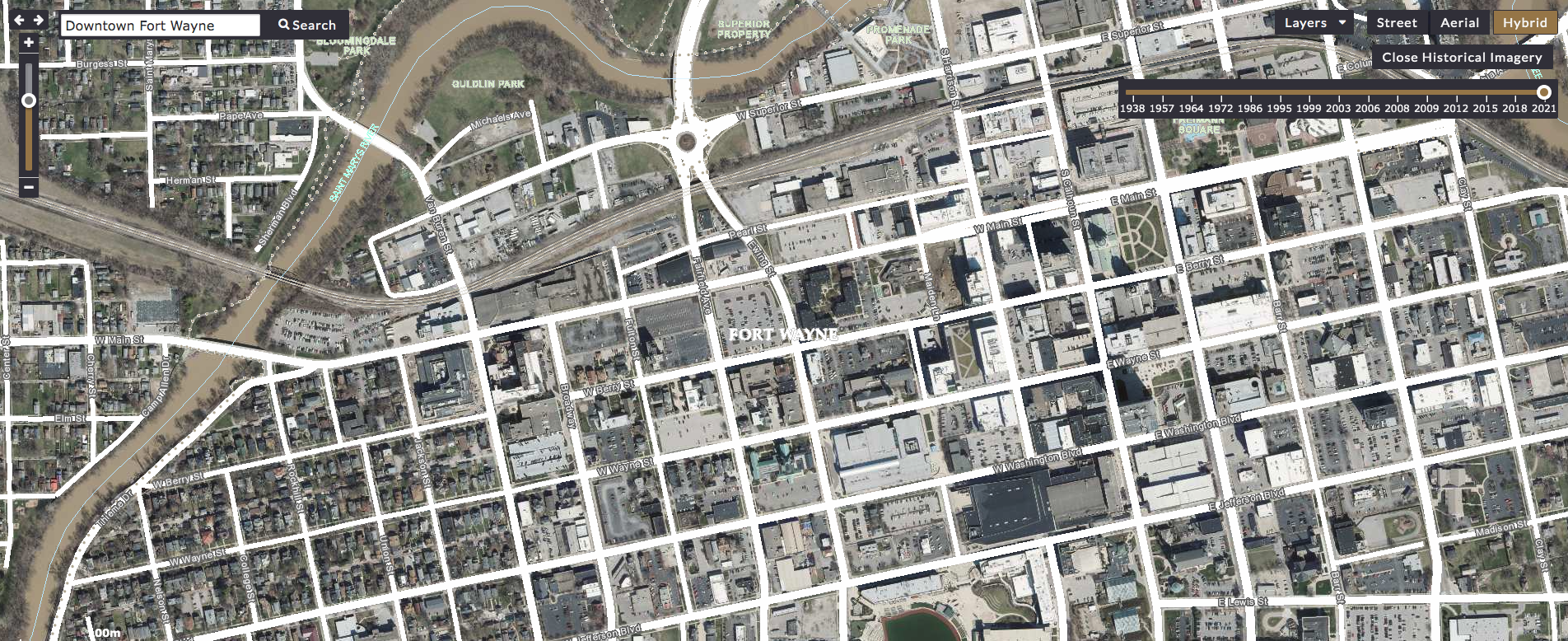 To access historic aerial views of Downtown Fort Wayne, visit the digital iMap Allen County GIS Data Viewer. In the upper right corner, click “Hybrid,” and then click “Historical Imagery View.” It will default to a 1938 map and offer a timeline in the upper right corner where you can scroll through the years up to 2021. You can use the search bar in the upper left corner to narrow in on specific addresses.