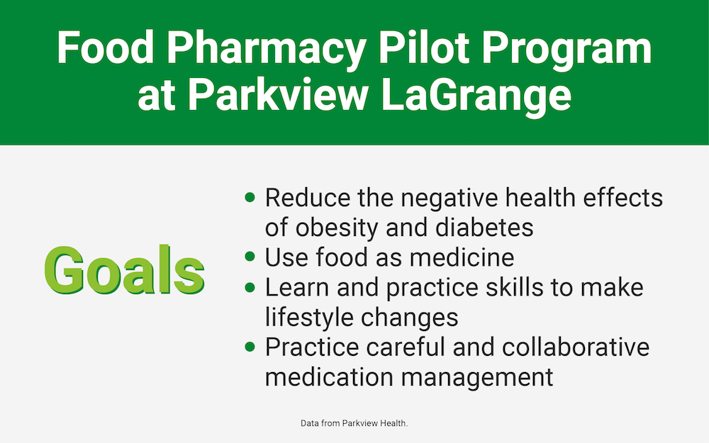 Food Pharmacy is open to all physicians—to refer their patients—in the LaGrange County area. According to a Parkview Health spokesperson, there have been discussions about implementing a Food Pharmacy program elsewhere in the Parkview system, although a startup date has not been determined.
