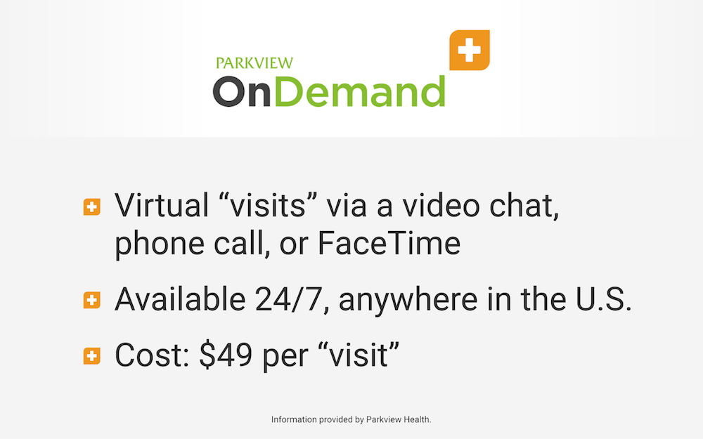 Another “virtual” innovation in healthcare is Parkview OnDemand, which offers video visits, phone calls, or FaceTime sessions with Parkview clinicians for patients anywhere in the country, 24/7. The cost for this service, which does not accept health insurance, is $49.00 per “visit.”