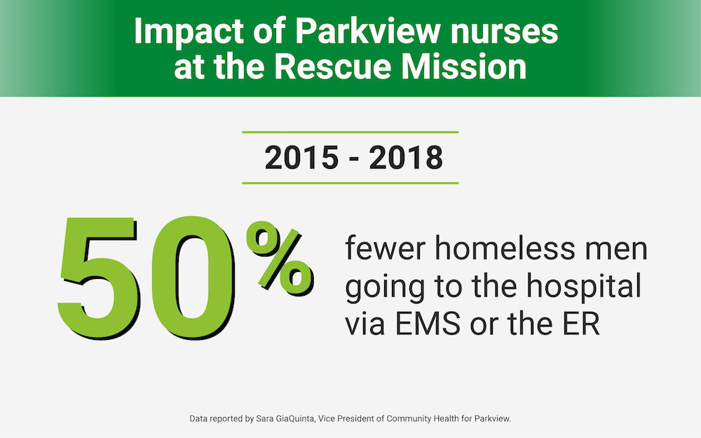 A team of registered nurses from Parkview, along with a dietitian and community health worker, serve the male homeless population at a small clinic inside the Rescue Mission in Fort Wayne.