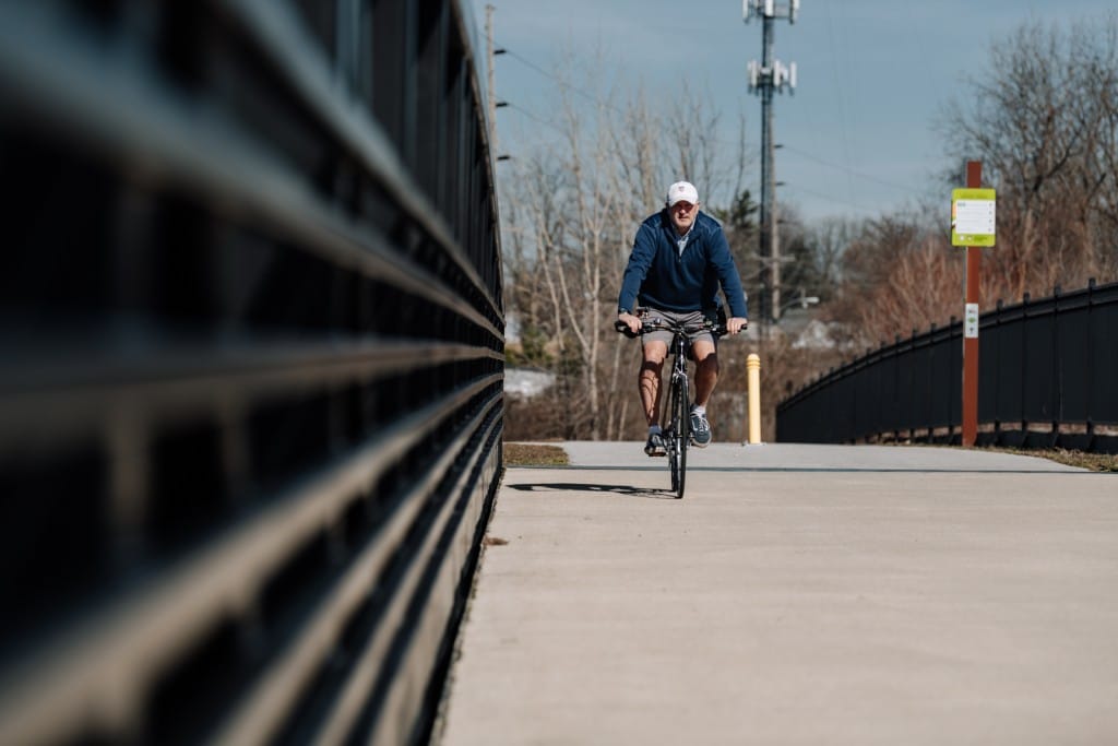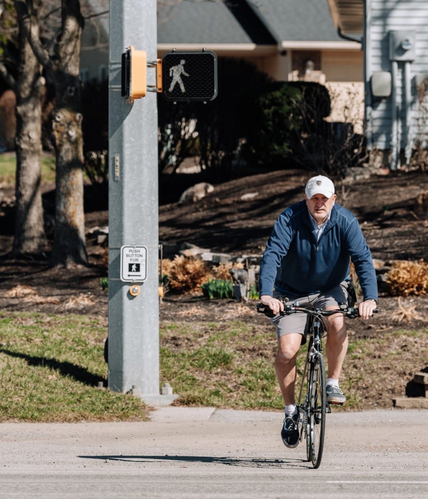 Crossing over Engle Rd. at Statesmans Way, Roger Carroll Jr. heads towards the Lutheran Health Trail Center in Fort Wayne, IN. Photo by Rachel Von Art LLC.