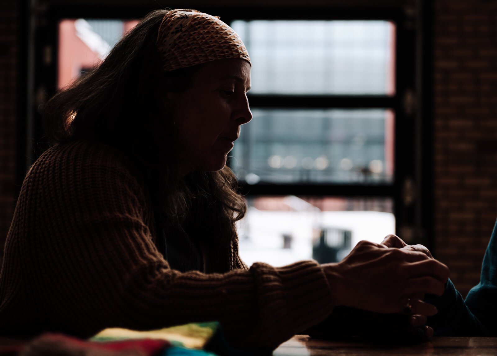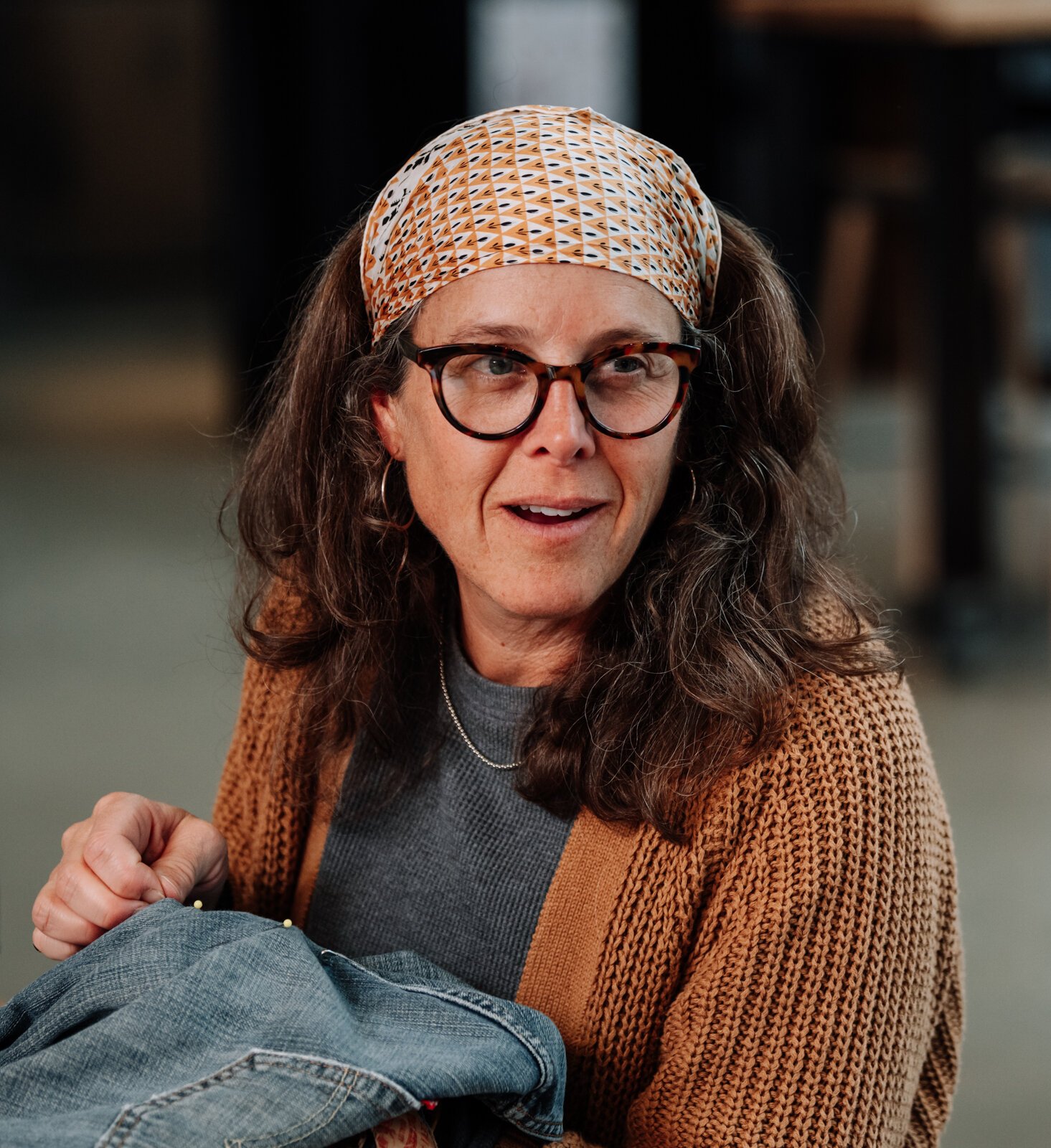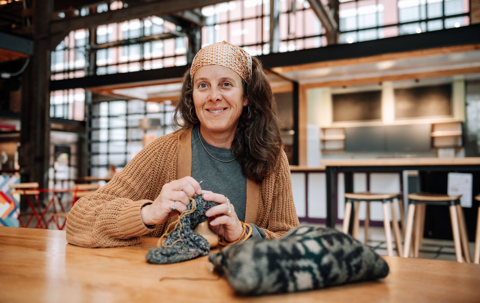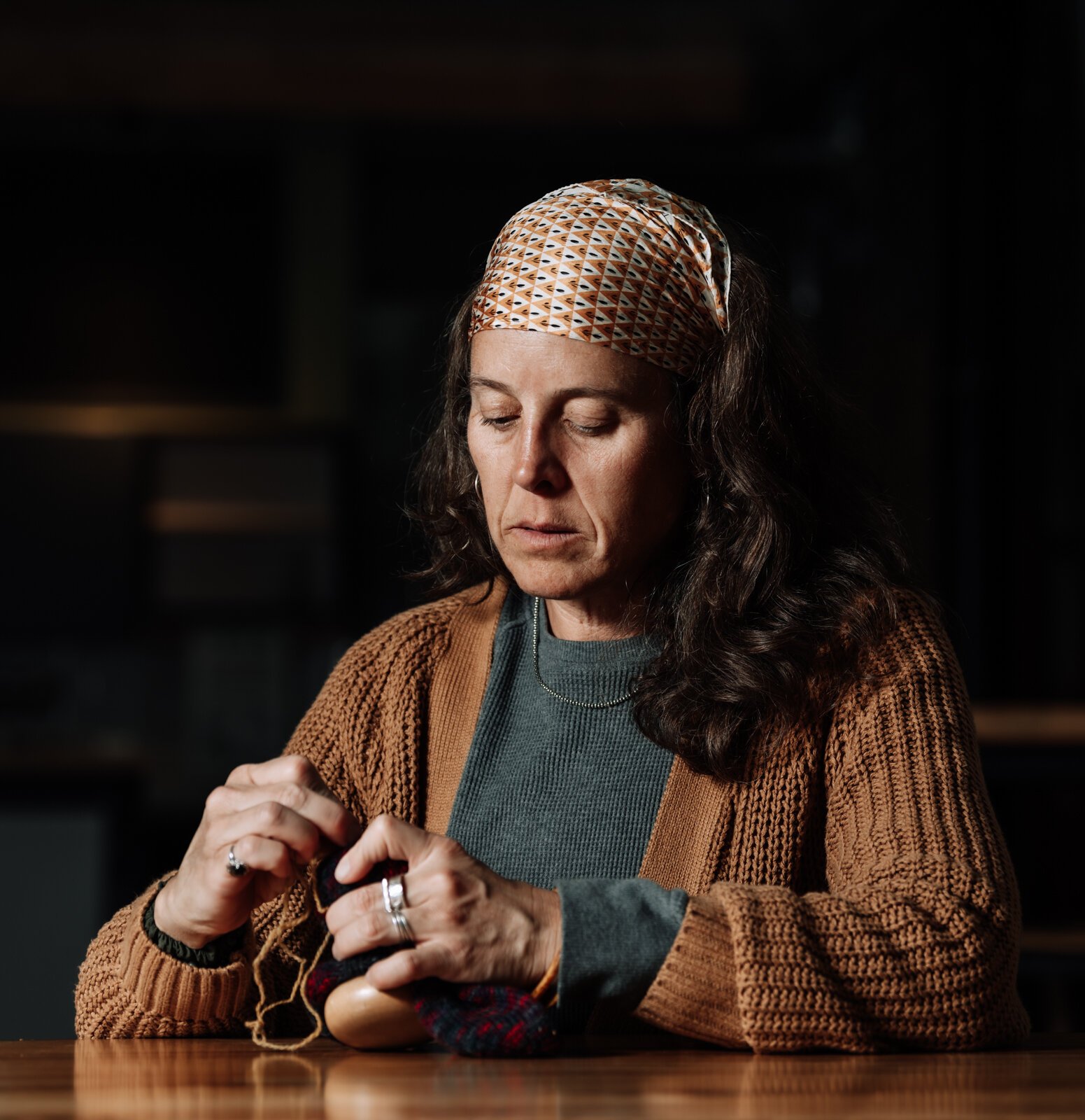 Megan Burton, owner of K1nd Goods, works on mending a sock