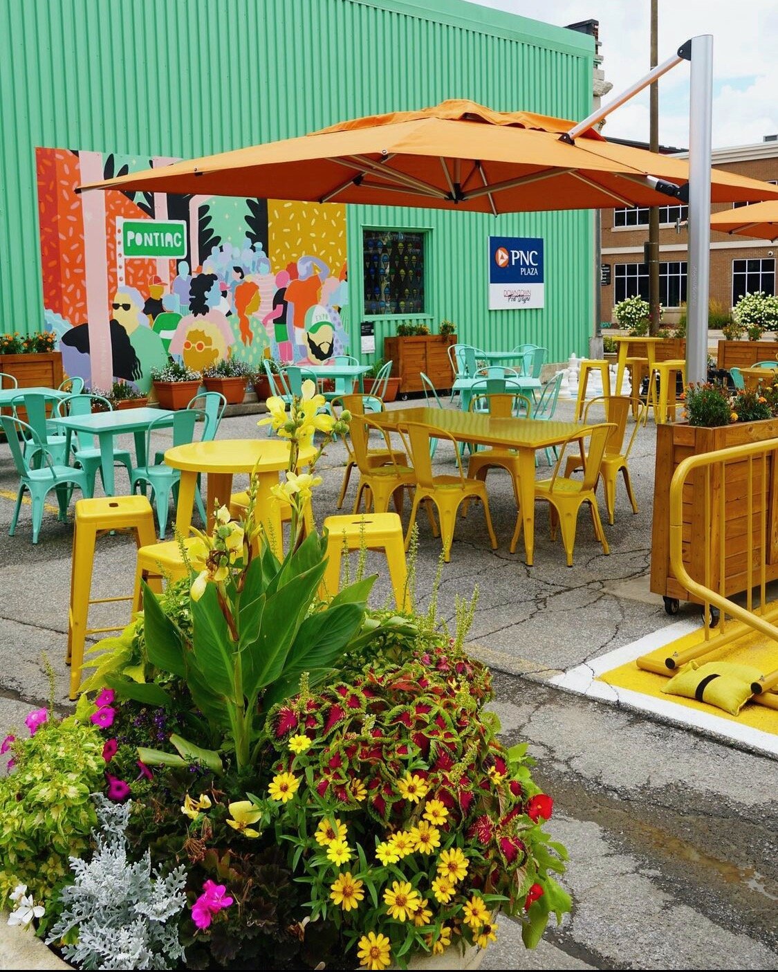 "The public space includes outdoor dining tables and chairs, a life-size chessboard, an oversized version of the game Twister, bike racks, umbrella shade sails, and Lyndy Bazile’s 'Pontiac'—a mural installation provided by Art This Way."